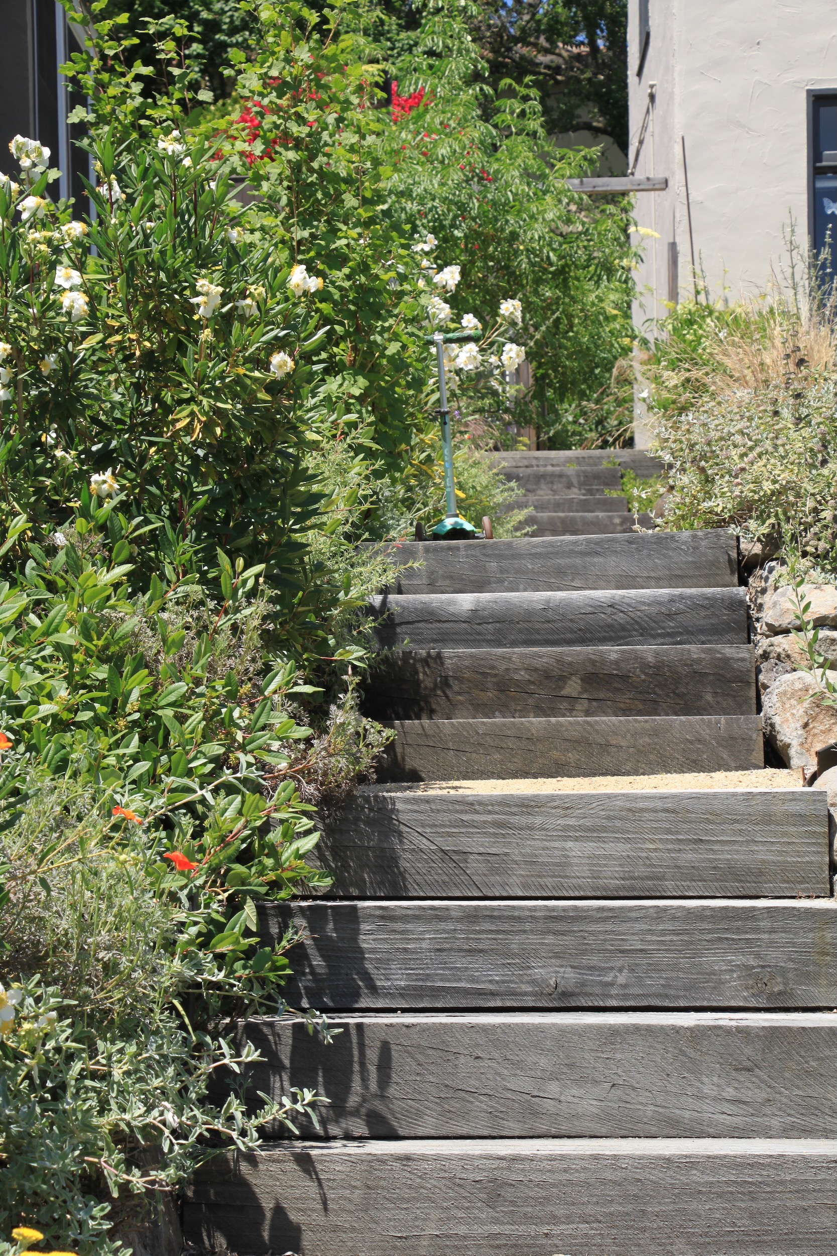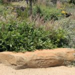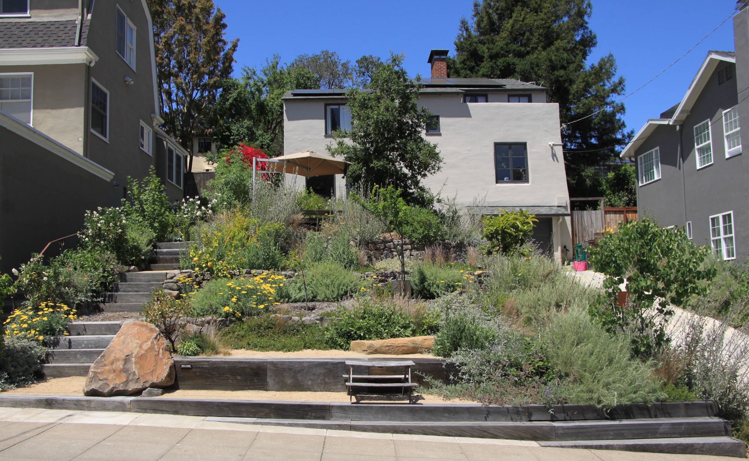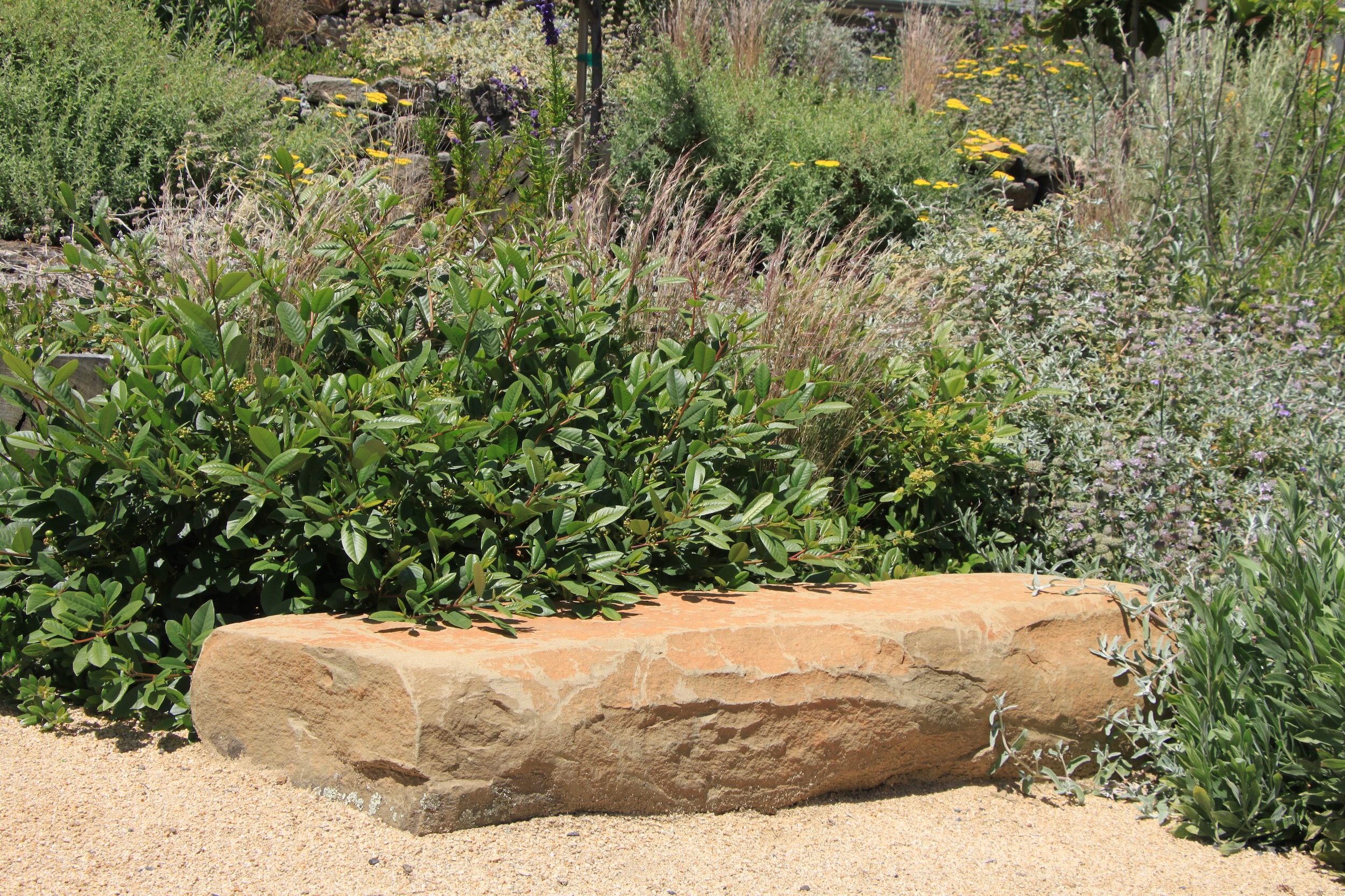 Large boulders, custom-milled eucalyptus steps, dry stacked retaining walls, and a travertine dining table overlooking the garden are the perfect accompaniments to the delightful combination of plants that cascade down the slope. Passers-by are welcome to take a seat on the bench at the base of the garden and enjoy this peaceful oasis.