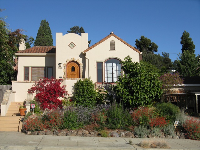 • The back garden, designed by Ann, contains a very large deck around which natives, such as California lilac, red-flowering currant, grape, and manzanita have been planted.