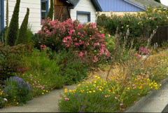 Showcase feature: This eclectic garden is a riot of spring color and a delightful mixture of California natives, ornamentals, fruits, and vegetables. Designed and installed by the gardeners, Anni and Carol’s garden offers visual pleasure throughout the year. This diverse garden contains 130 species of native plants, and hundreds more species of ornamentals and edibles. The parking strips, front and side gardens receive no summer water (except for first-year plants and a young redbud). The coastal prairie plants were selected because they might have grown on this site when the Huchiun Indians lived in their nearby village along Wildcat Creek.