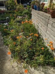 The entrance-way to Leadership Public High School, formerly a scruffy lawn and hedges, has been planted with deer grass, manzanitas, sages, coyote brush, hummingbird sage, and a few other species of native plants. It is full, and lush. Directly across the street is Mount Eden High School; the long parking strip there, a former weedy area, was sheet mulched in the fall of 2025: it will be planted with natives in January of 2026.