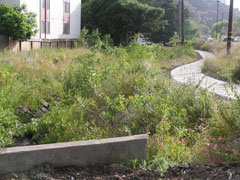 Showcase feature:A stretch of Cerrito Creek, channelized, degraded, and running between a shopping mall and apartments, has been restored by pulling the parking lot back from the creek, removing concrete from the banks, creating a more meandering channel, and installing a creekside trail. Invasives were removed and the area was planted with natives. Volunteers from Friends of Five Creeks contributed plants, seating, interpretive signage, maintenance, and fill-in planting.