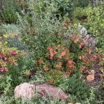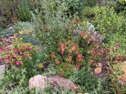 This delightful garden, designed and installed by Dave and Jennifer, is a riot of color in spring and summer, with nearly a hundred different types of natives blooming in a bountiful succession. The profuse blossoms of more than forty monkeyflower plants in this garden delights winged and two-legged visitors alike.