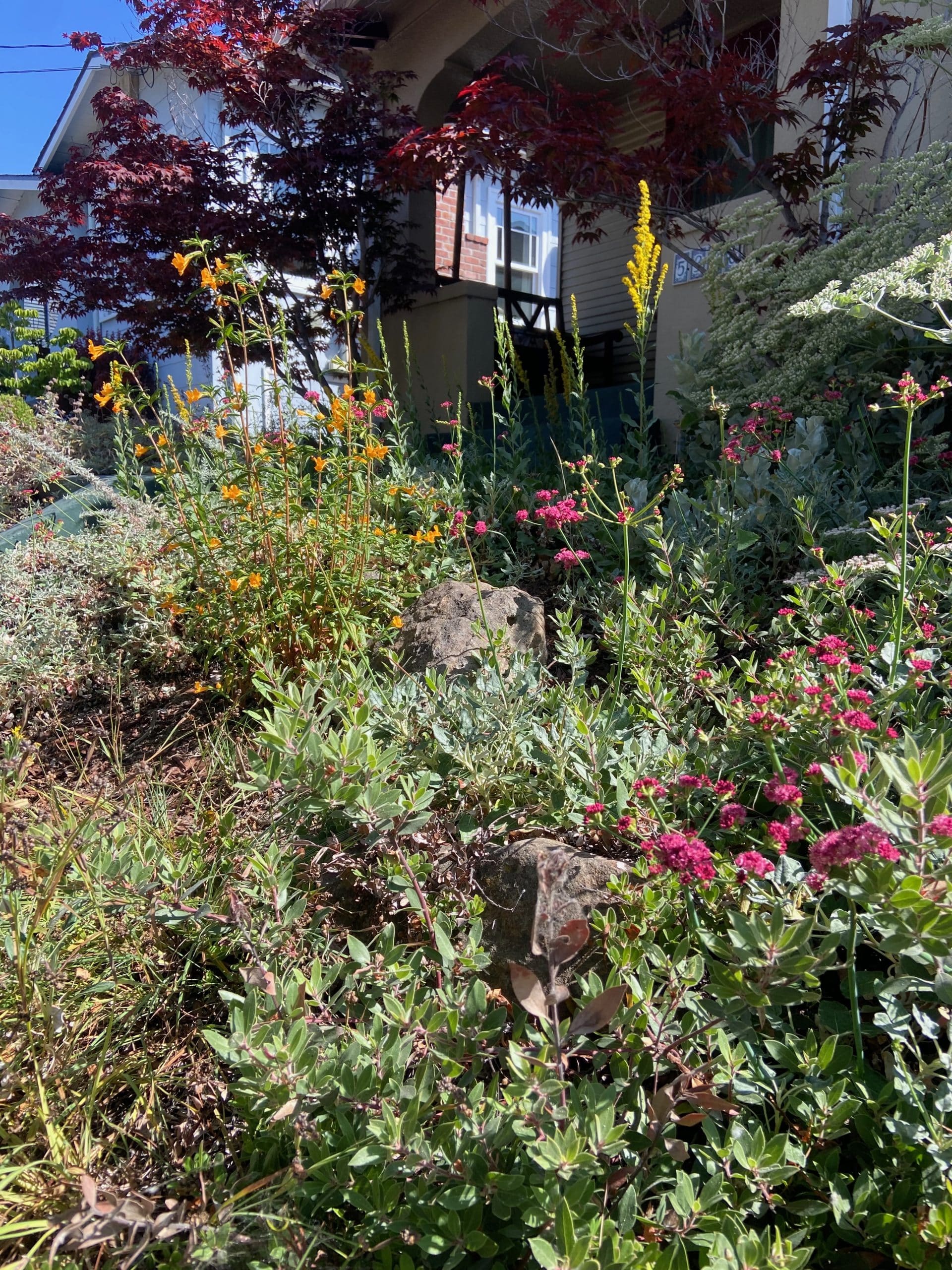 David’s neighbor, Genie Barry, a “native garden whisperer,” convinced David to remove the lawn and plant natives. The inviting, attractive, low-maintenance and low-water-use garden David designed and installed contains drifts of Sonoma sage, California fuchsia, blue-eyed grass, and goldenrod, which suit this small garden perfectly. Accents of manzanita, monkeyflower, and gum plant enliven the core plant palette.