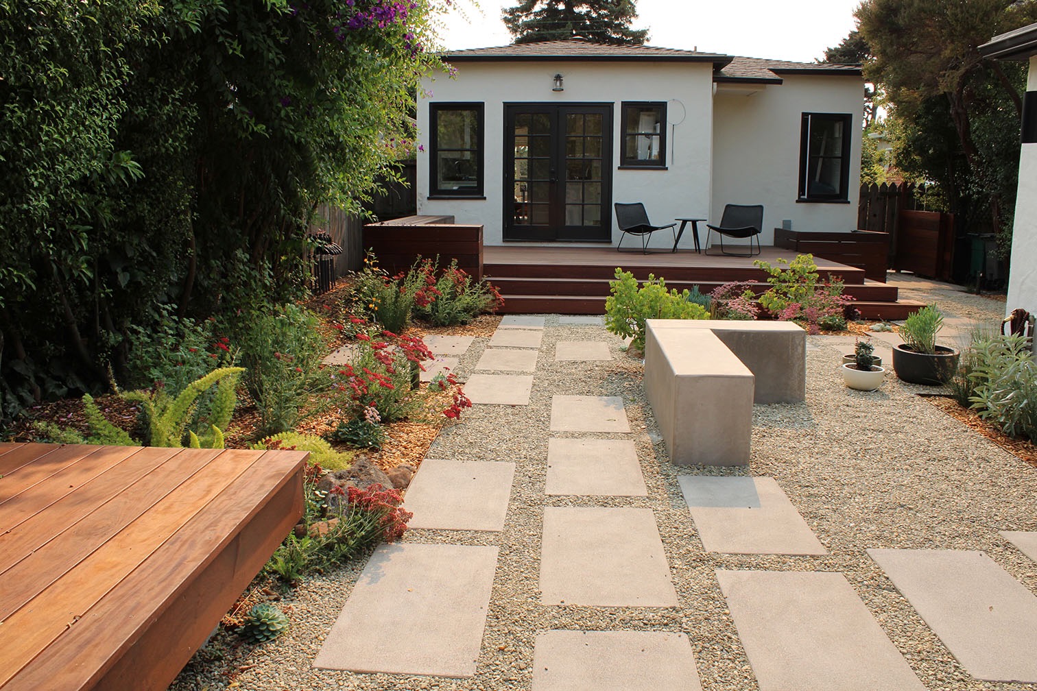 The garden was patches of scruffy grass separated by odd pavers with a sandbox on one side, that was overlooked by a tiny deck. What Dawn had in mind was a beautiful, peaceful, low maintenance, water-conserving, California native plant garden that had space for entertaining—and that is Cris Cruz and Peter Rohan of Landspaces, designed and installed.