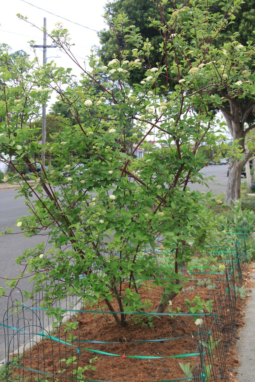 • The beautiful multi-trunked red-twigged dogwood in the parking strip creates visual interest, a privacy screen for the house, and inviting places for birds to rest in while snacking on insects.