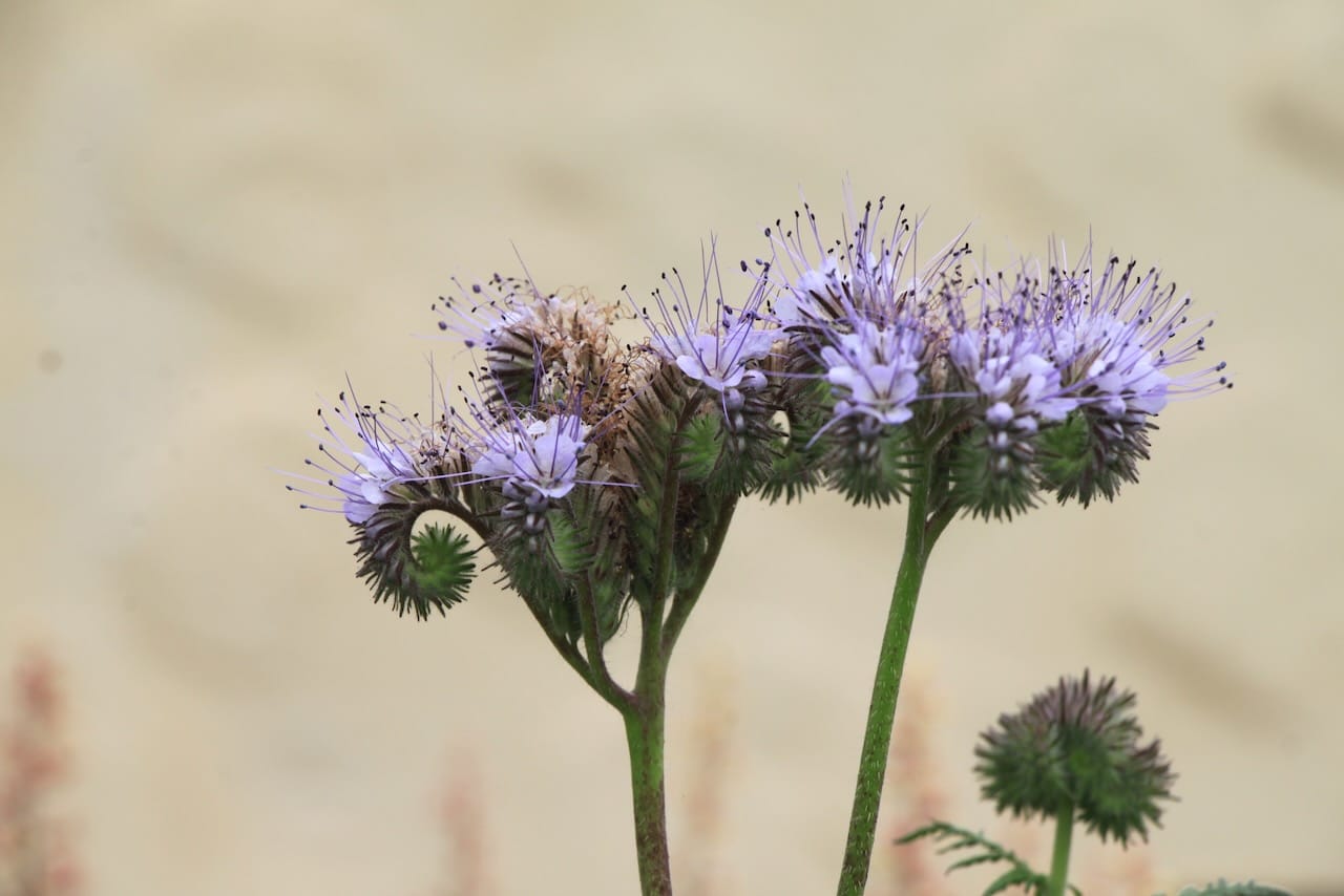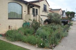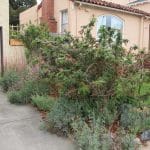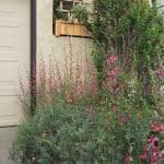 Buckeye, skipper, and painted lady butterflies are attracted to the vibrant abundance of blossoms in her flower-filled front garden. Monarchs lay eggs on the milkweed. Hummingbirds love the fuchsias. Leafcutter bees visit the parking strip to nosh on the redbud leave, and carpenter bees and other native bees visit the garden. In the mornings, flocks of sparrows chatter in the closely woven branches of the sagebrush.