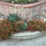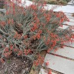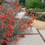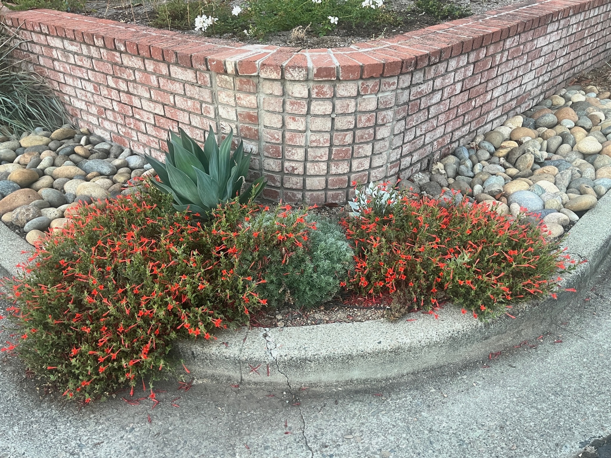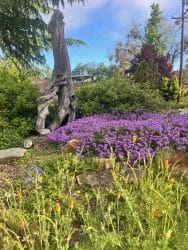 Around the garden, seven varieties of manzanita (‘Dr. Hurd’, ‘John Dourley’, ‘Sunset’, ‘Shatterberry’, ‘Baby Bear’, ‘Point Arena’, and ‘Monterey Carpet’) provide year-round structure, their burgundy bark and evergreen leaves contrasting beautifully with the blue, fragrant blooms of California lilacs (‘Concha’, ‘Yankee Point’, and ‘Joyce Coulter’). Along the street, blue-green blades of ‘Canyon Prince’ wild rye, coastal sagebrush, chalk Dudleya and the soft gray foliage of ‘Everett’s Choice’ California fuchsia complement these shrubs. Penstemons and yarrows brighten the garden while the slower-growing natives continue to fill in..