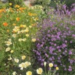 The entrance is framed by berms that come alive each spring with native annuals including clarkia, phacelia, and lupine, along with both wild-type and cream-colored “Moonglow” poppies. Interspersed among these annuals are native bulbs such as blue dicks, wild onions, Ithuriel’s Spear, Brodiaea, and camas, which add seasonal bursts of color and texture. This year, the collection of Dudleyas and Lewisias was moved into a shadier spot closer to the house to protect them from the intense summer sun, where they are joined by a particularly Dr. Zeussian giant Coreopsis, and other coastal plants.