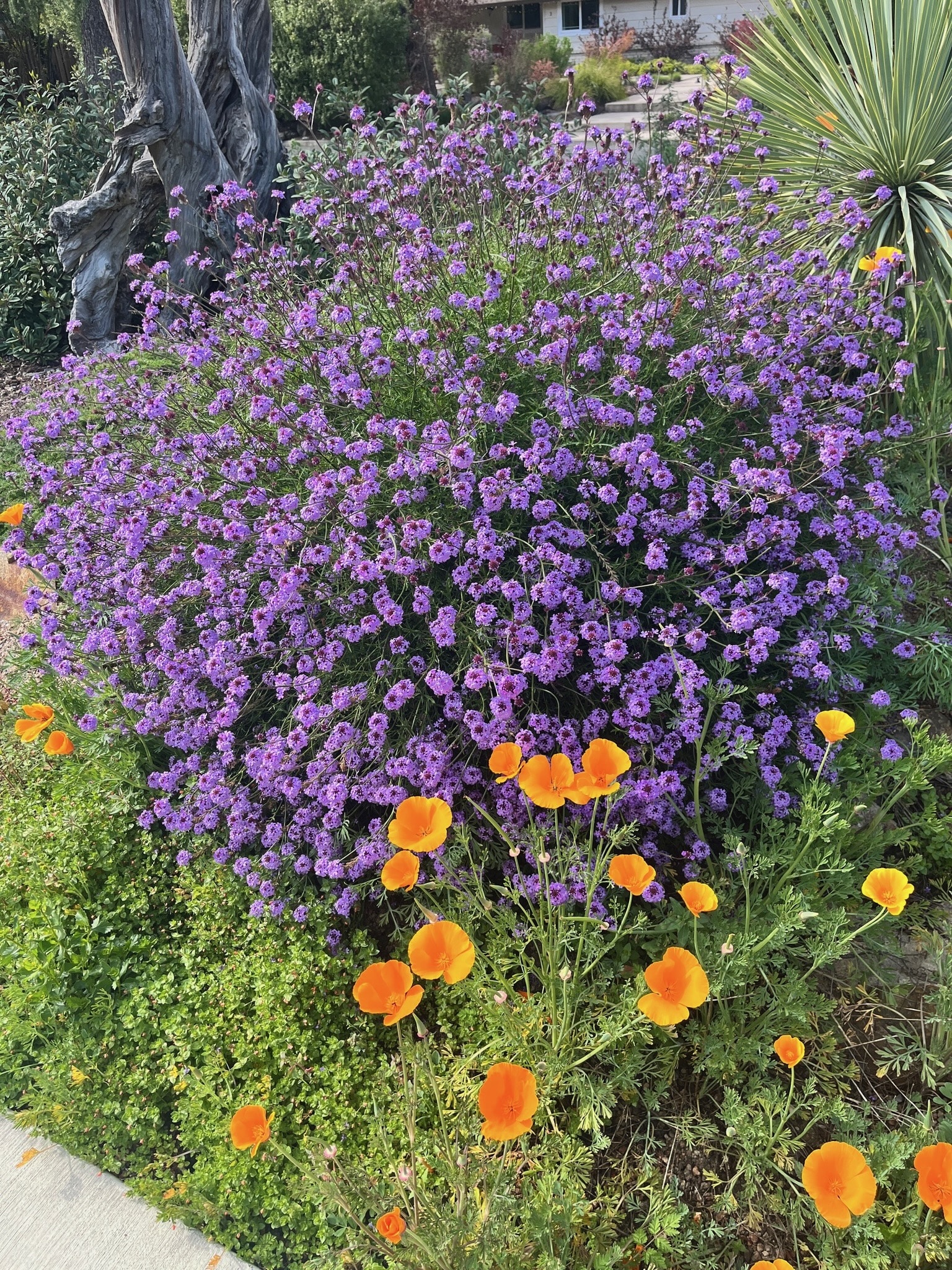 The large lawn that covered this spacious corner lot when Glenn and David purchased the house in 2021 didn’t last long. Glenn, Executive Director of the Golden Gate Bird Alliance, envisioned a garden that would be beautiful, low-maintenance, and nearly self-sufficient once established—thriving without pesticides and providing essential food, shelter, and nesting areas for birds. Glenn sheet-mulched away the lawn, and together with John Bain of Mariposa Garden Design, created the garden that now flourishes here.