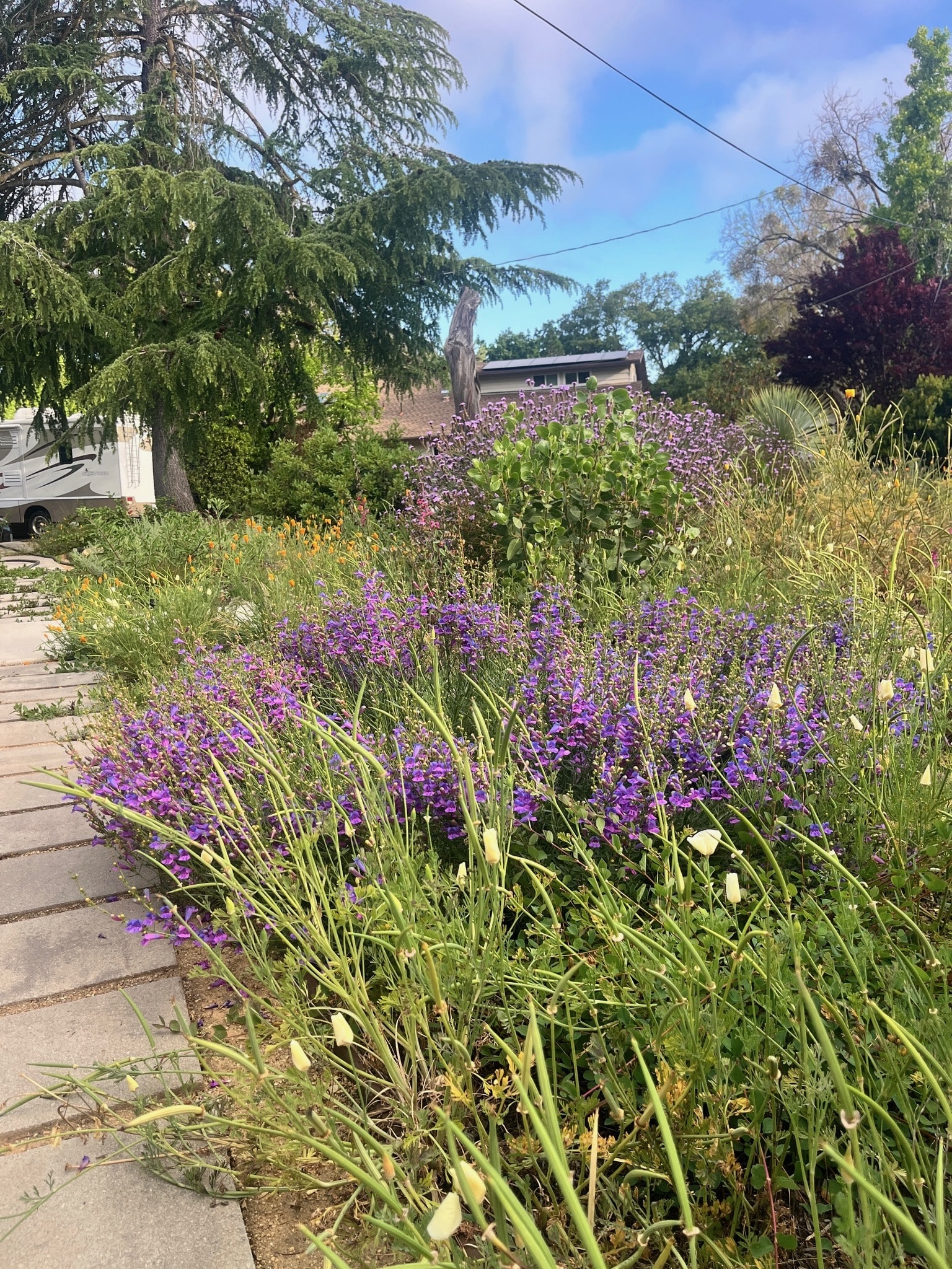 Keystone species—our own, local ecological powerhouse plants—in this garden include valley oak, currant, California lilac, manzanita, sage, coyote brush, snowberry, and penstemon.