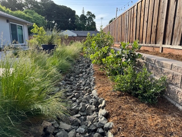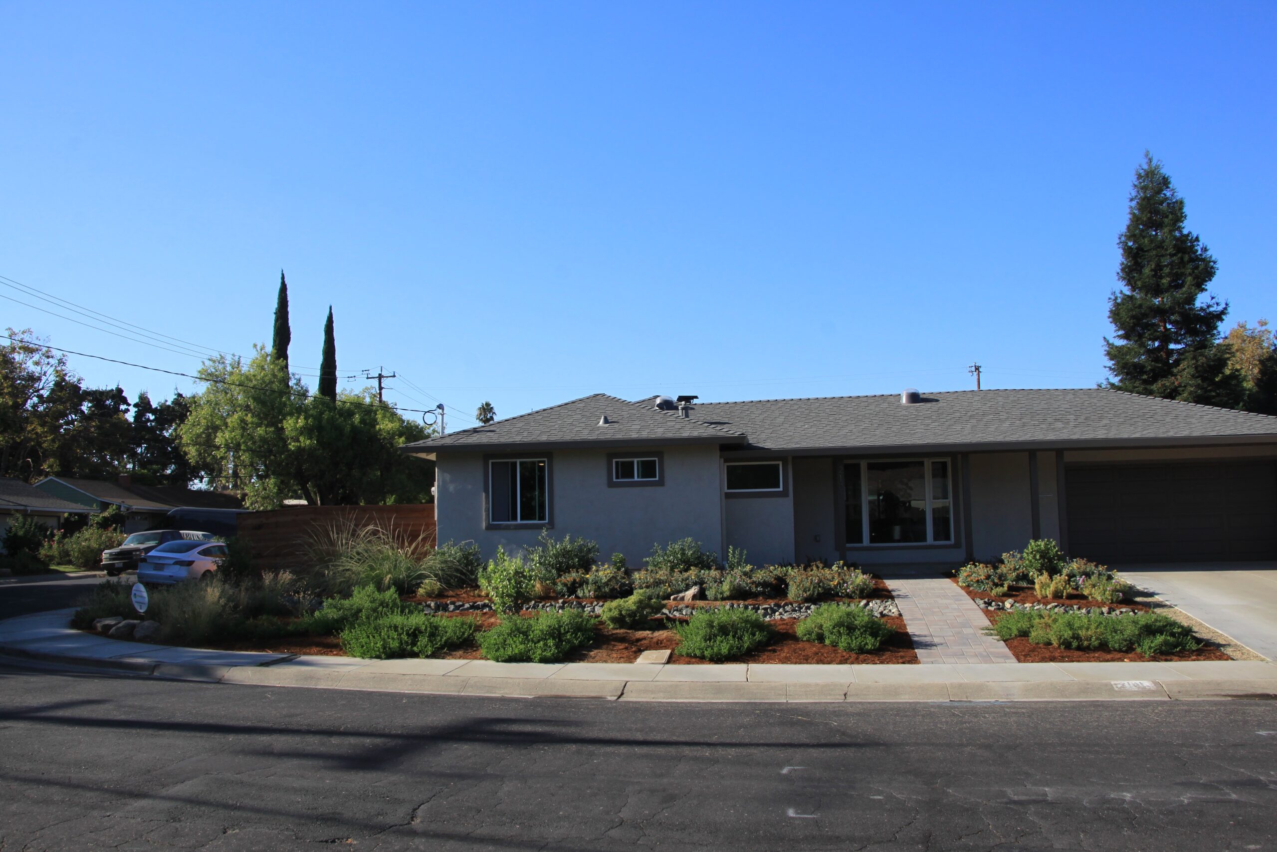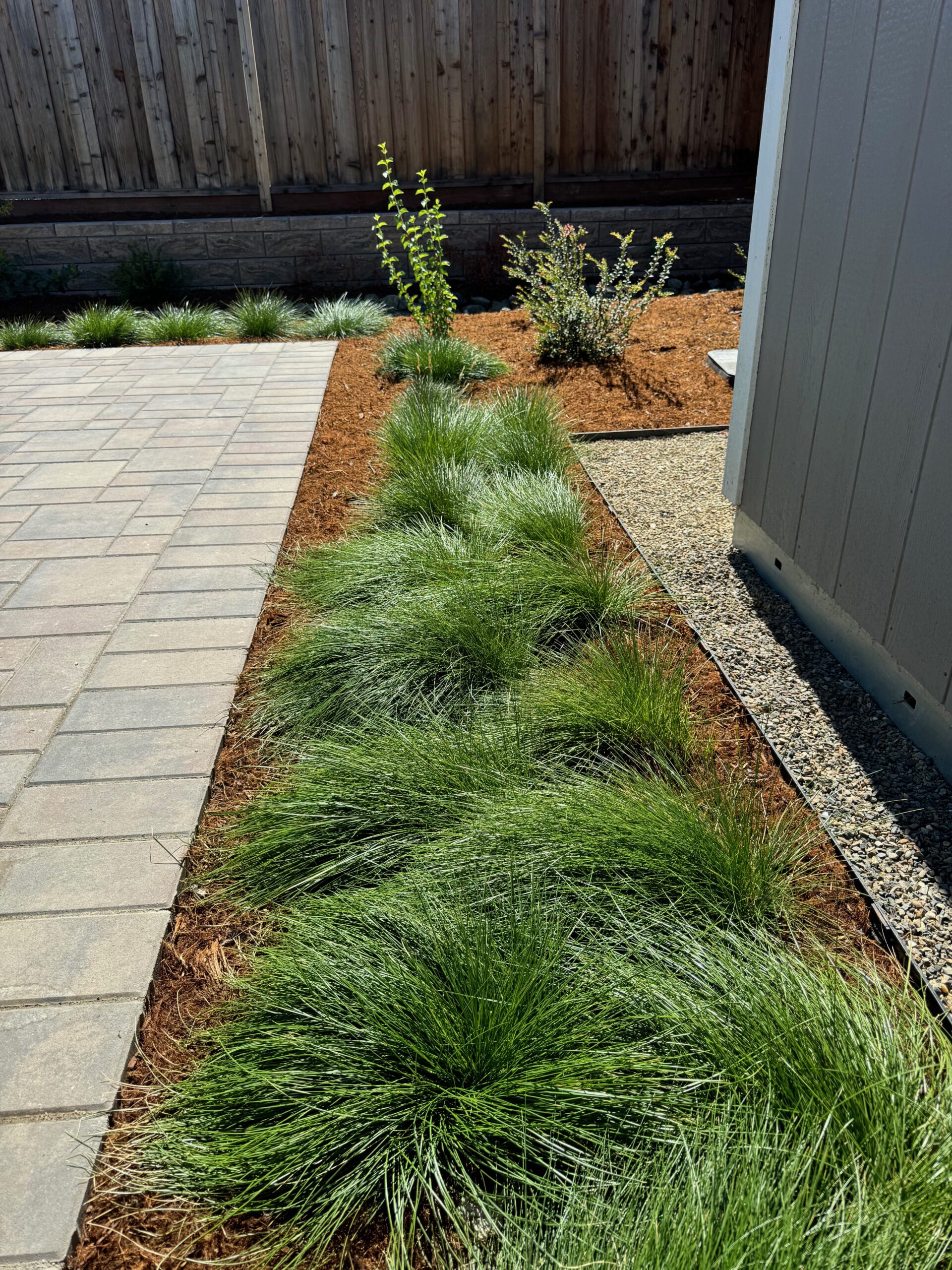A gigantic RV pad in the back yard was demolished, and replaced with pomegranate and citrus trees. More than one hundred lush-looking, water-conserving Point Molate red fescue, planted from 6” stub pots, brighten the back garden.