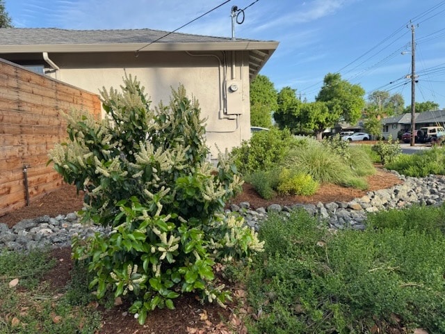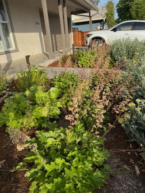 Gonzalo loves designing gardens with native plants! He says, “California natives provide such a rich plant palette: there is every texture, color, shape, and size you can imagine.” In his own front garden, the sunny areas bordering the sidewalk have been planted with attractive swaths of prostrate coyote brush, fragrant coyote mint, and blue grama grass, with their cheerful, fine-leaved seed heads. Shadier areas of the front garden are home to Island alum root, and sword ferns. Scattered throughout the garden are manzanita, California lilac, coffeeberry and toyon, which provide stability and structure throughout the year.