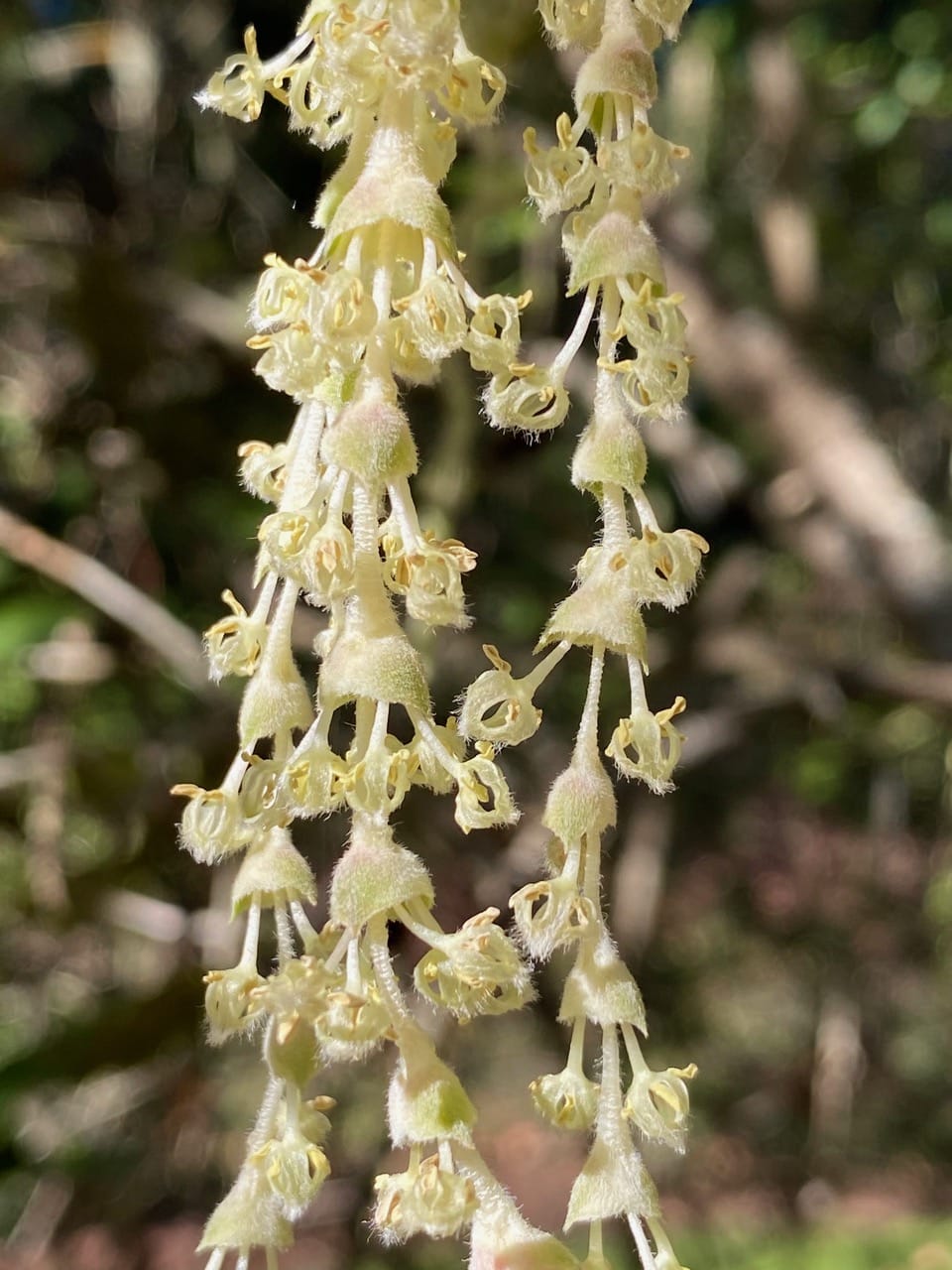 The Coast Silk Tassel, Garrya elliptica (family Garryaceae) is an evergreen shrub or small tree. It is dioecious, meaning male and female flowers are borne on separate plants. Flowers appear in winter, male catkin-like clusters are yellowish to greenish then gray, 8-20 cm long (“silk tassels”), female flower clusters are shorter, 5-9 cm long.