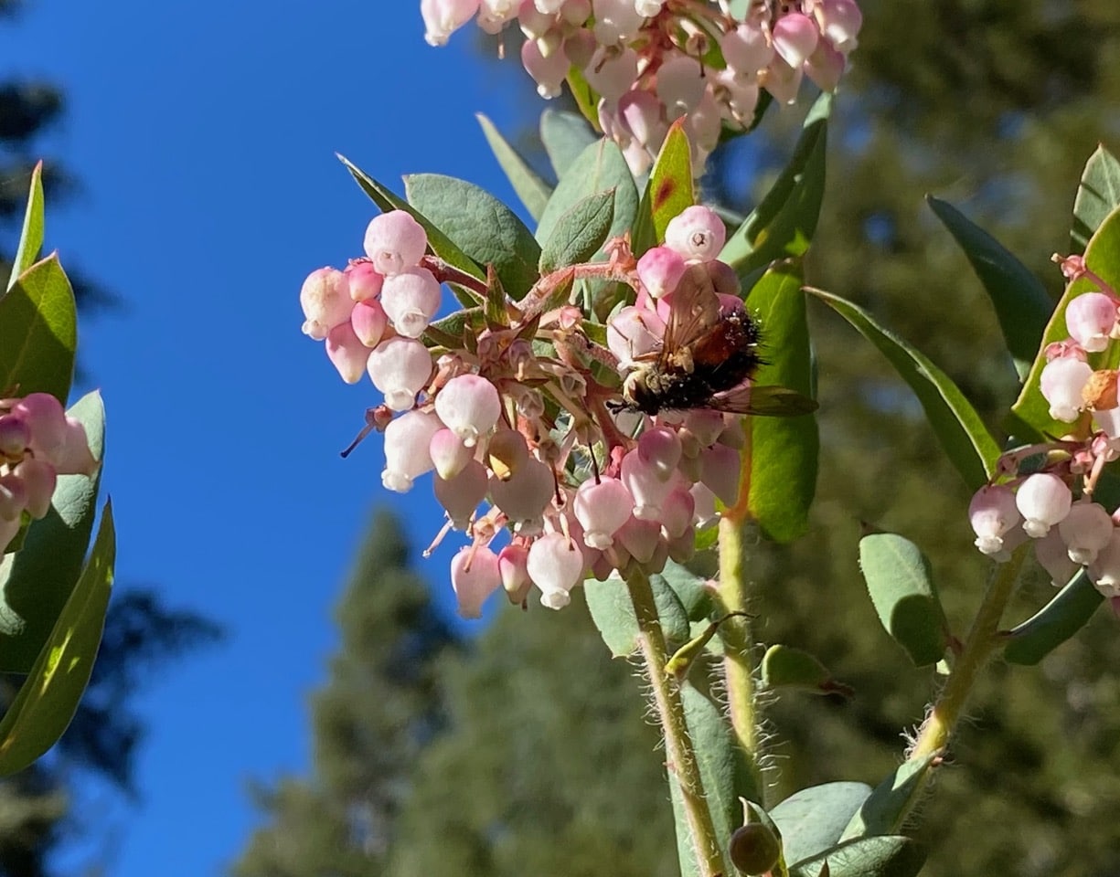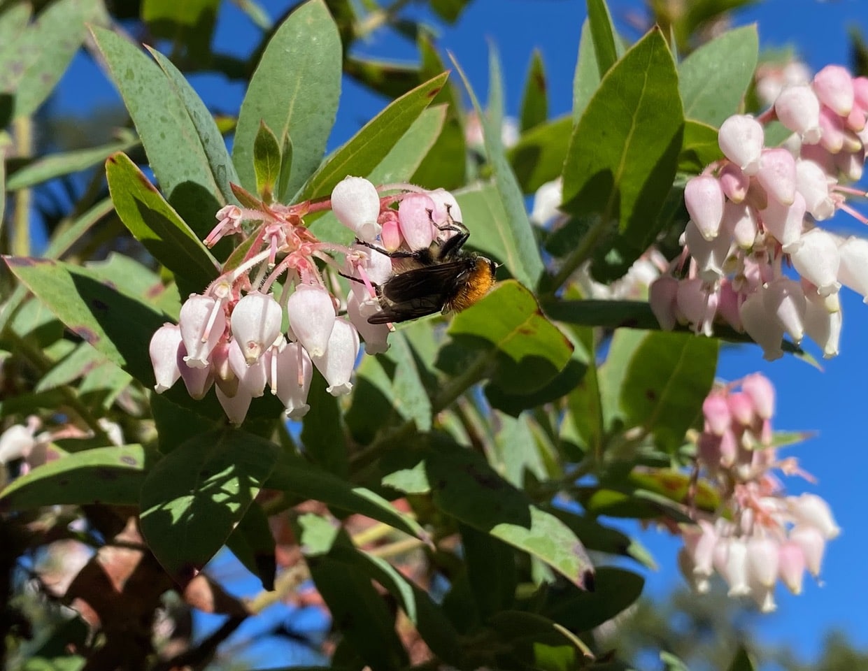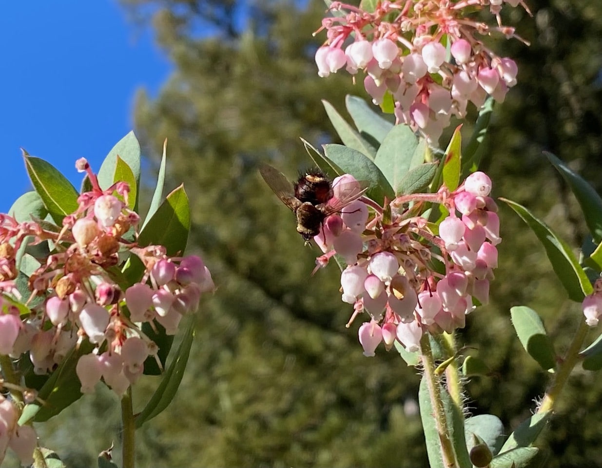 Ooh, who’s that on that cluster of manzanita flowers? It doesn’t look at all familiar to me, with a furry thorax of bright rusty color.