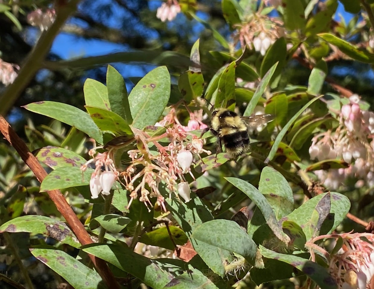 A queen Black-tailed Bumble Bee, Bombus melanopygus (family Apidae) is buzzing around a tall manzanita, stopping to take nectar from the flowers. How do I know it’s a queen? By her sheer size – she is about 3-4 times the average size of the worker bees of her species. Also, this early in the season, most of the bumble bees we see are likely queens that have freshly emerged from hibernation. They are the only ones that overwinter.