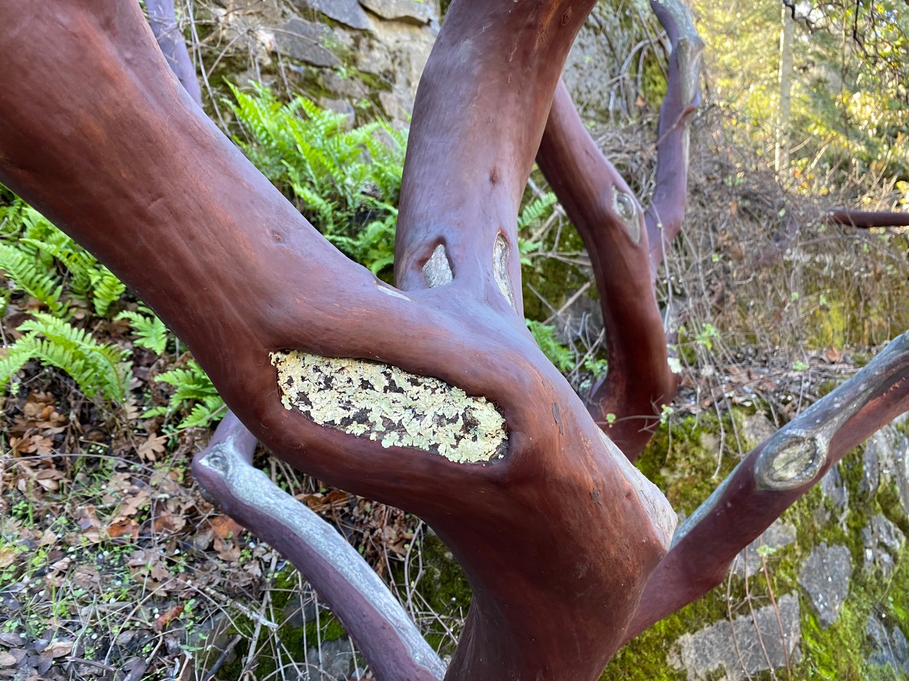 I have to smile as I pass a big manzanita with foliose lichens growing in the only places on its trunk not covered by bark – sections where branches have broken off or been pruned off. It’s a testament to the effectiveness of manzanita’s smooth and chemically-armed bark to prevent unwanted settlers.