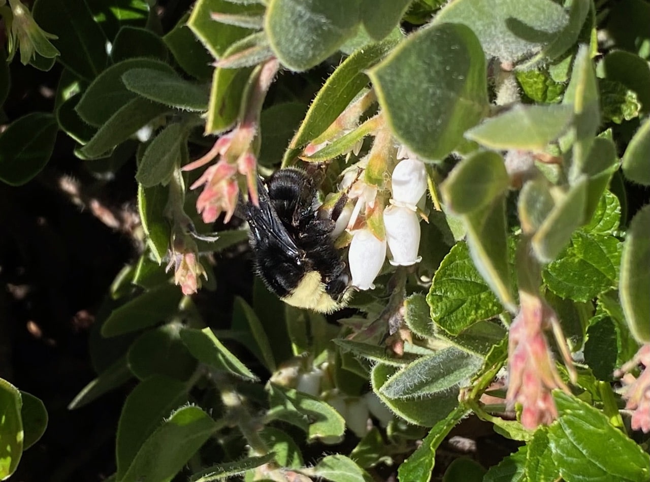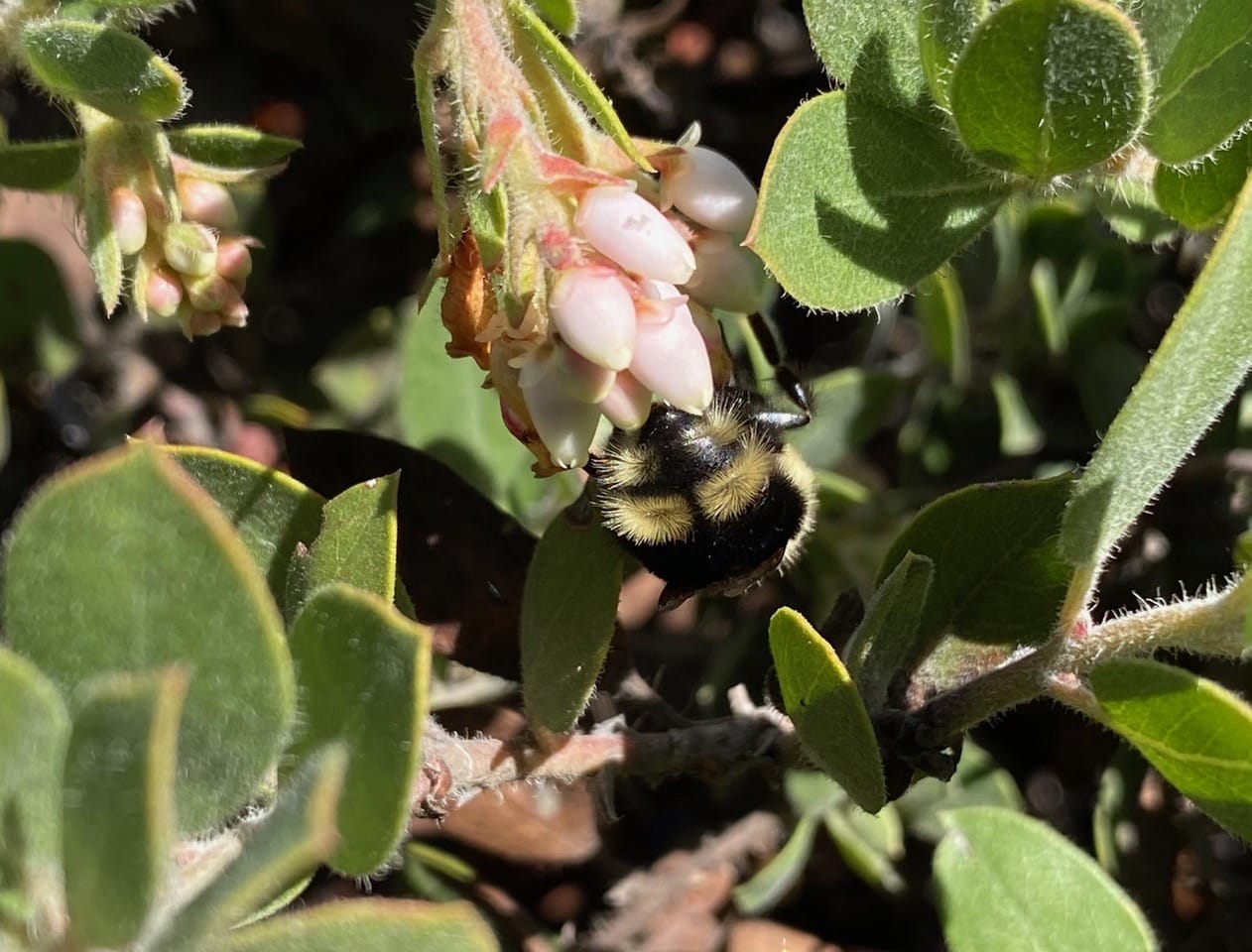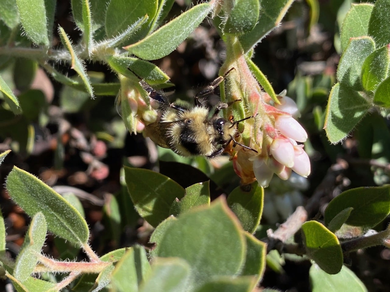A disheveled queen Black-tailed Bumble Bee, Bombus melanopygus (family Apidae) crawls through the dense foliage of a manzanita and emerges on a cluster of flowers. Wow, where has she been?