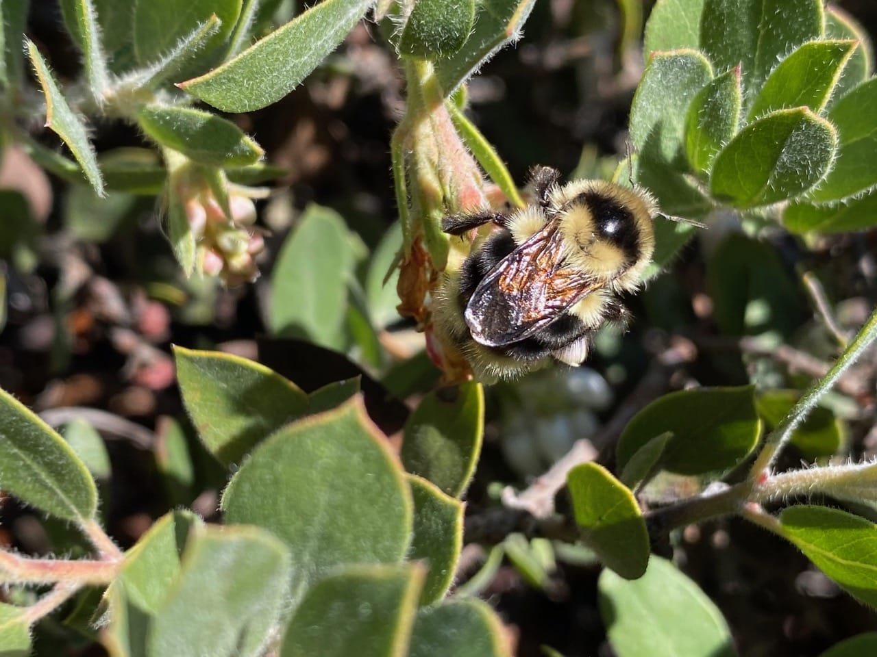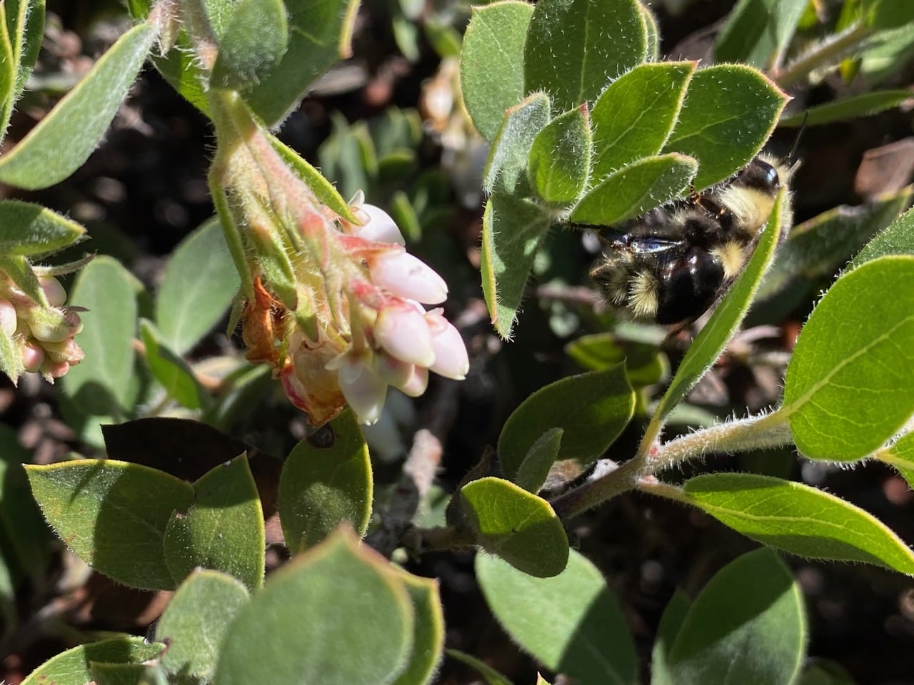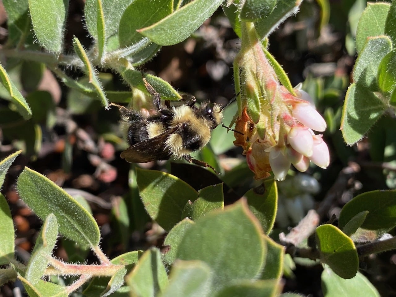 A disheveled queen Black-tailed Bumble Bee, Bombus melanopygus (family Apidae) crawls through the dense foliage of a manzanita and emerges on a cluster of flowers. Wow, where has she been?
