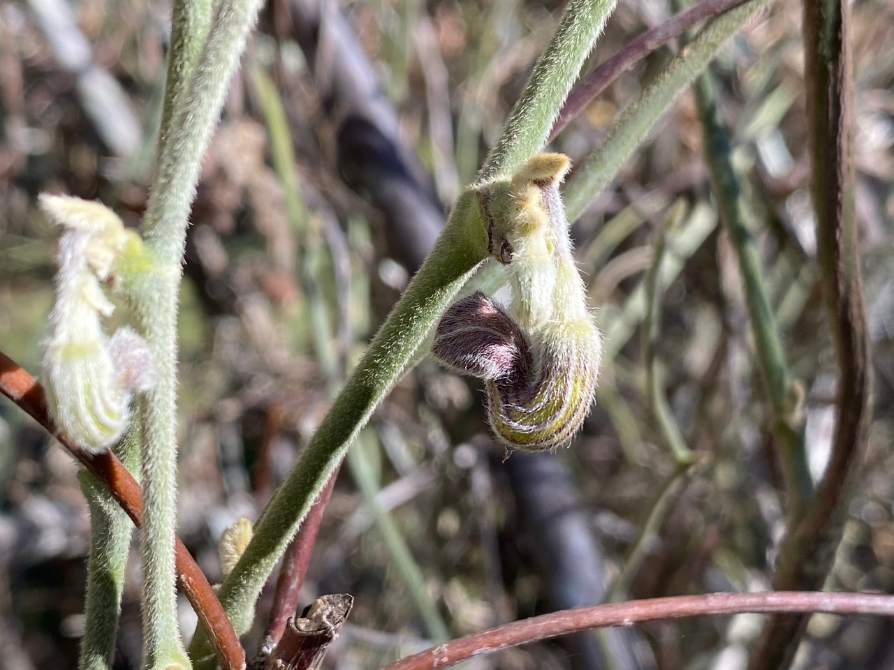 Look what this bud has unfurled – a hairy little pipe-shaped flower! In a sense, this should not have been a surprise – California Pipevine blooms before it leafs out.