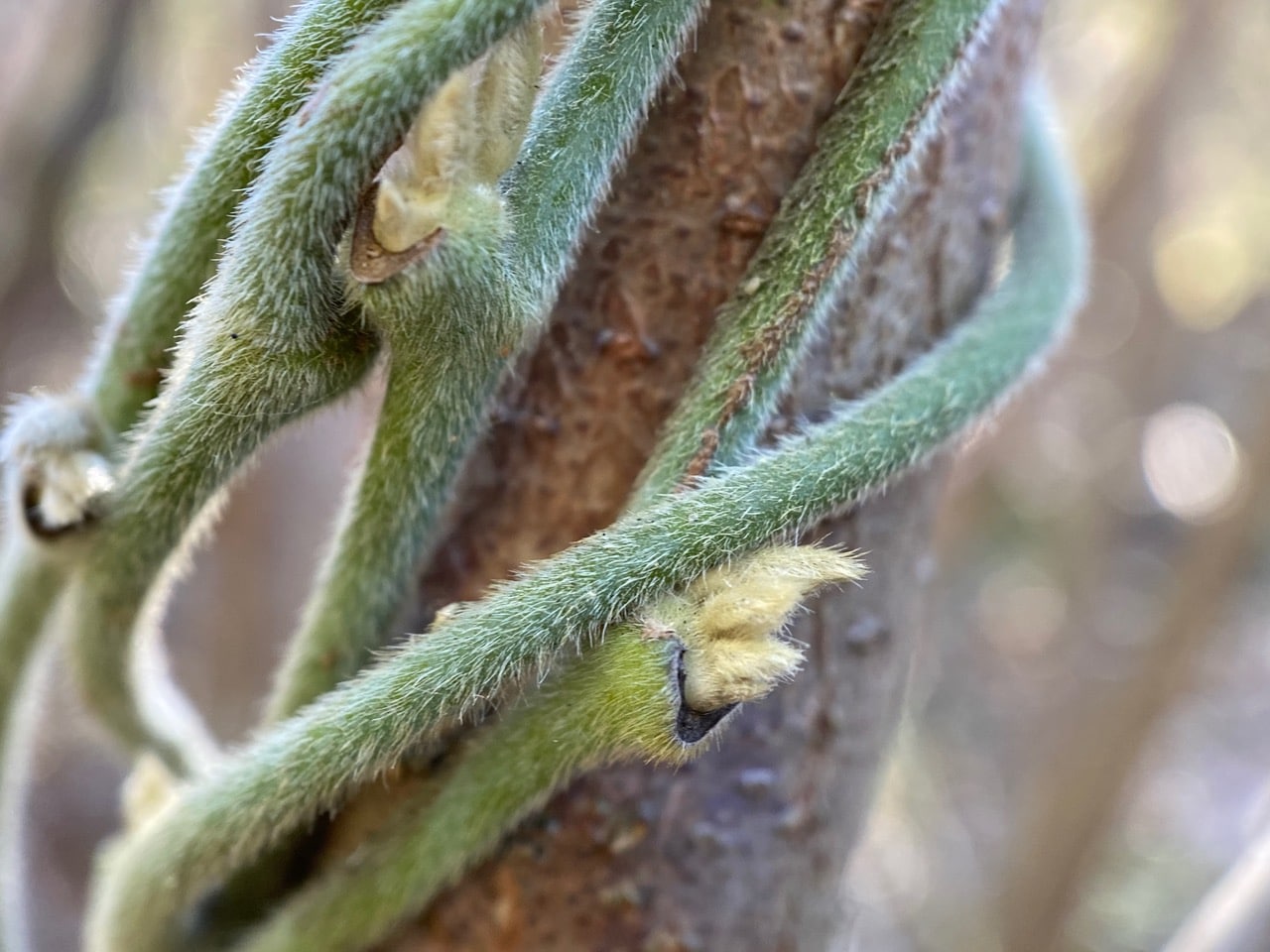 Nearby on the ground, several vines in search of support have joined forces by twining around each other, forming thick rope-like bundles.