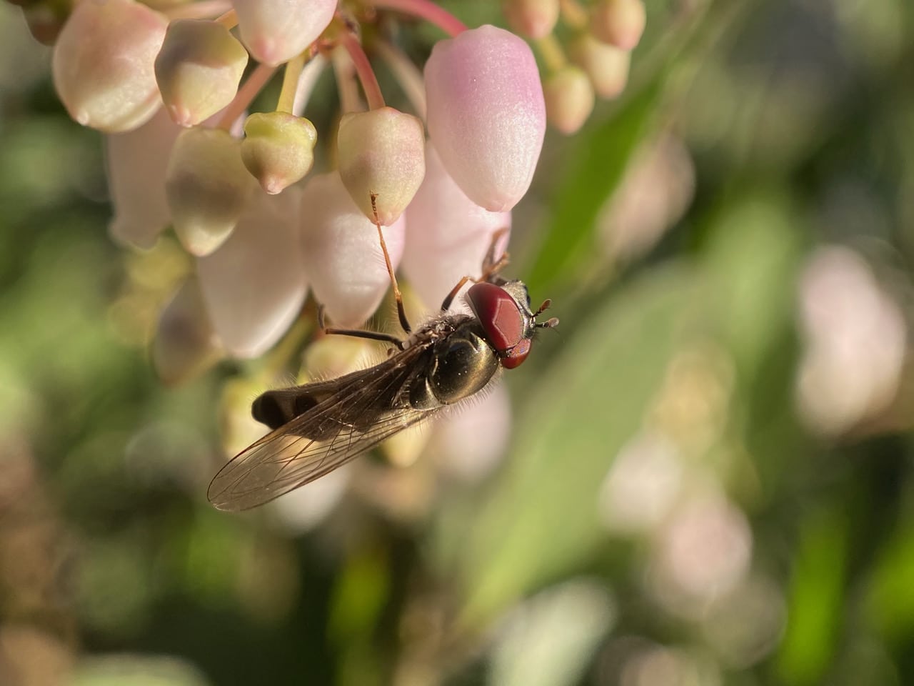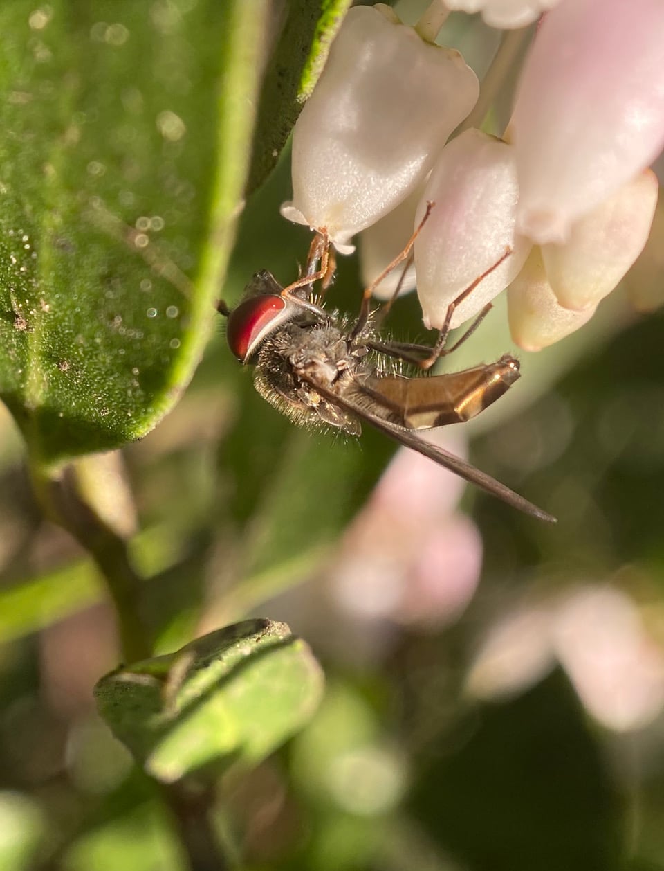 The Sedgesitter’s hairs light up in the afternoon sun as it probes a manzanita flower with its tongue. Hover flies are good pollinators, second only to bees. Adults feed on nectar and pollen. Many are sufficiently hairy for pollen to adhere to.
