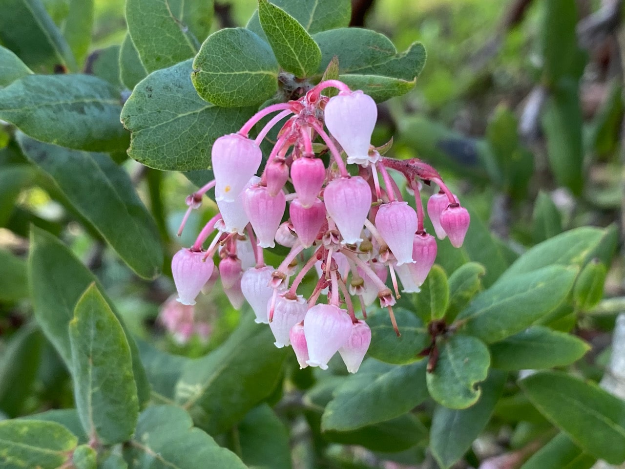 For a winter-blooming flower in California, it’s crucial that its pollen is protected from the rains. The Manzanita flowers (genus Arctostaphylos) are structured to withstand the wet season – urn-shaped with small opening, the nodding flowers are tightly clustered.