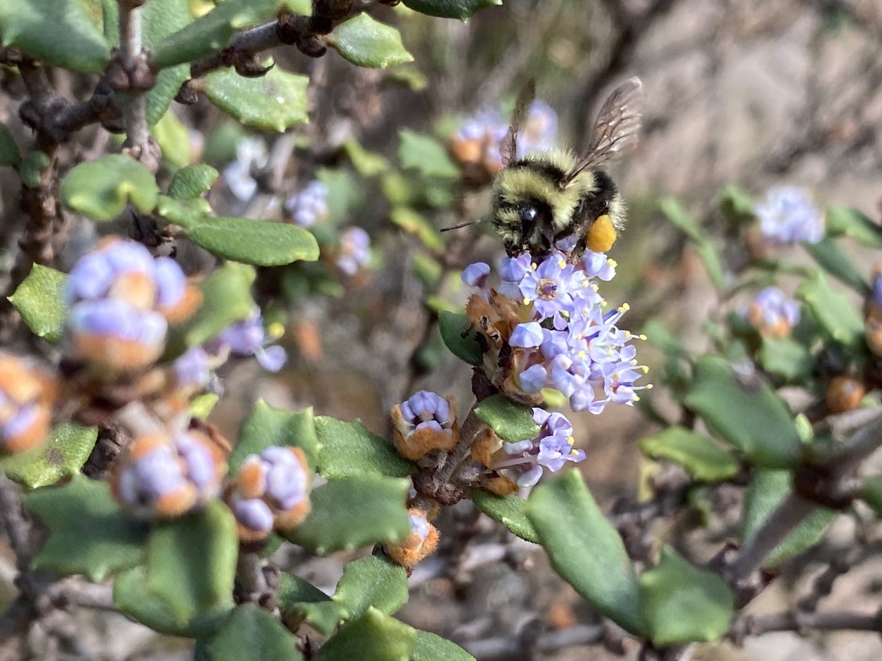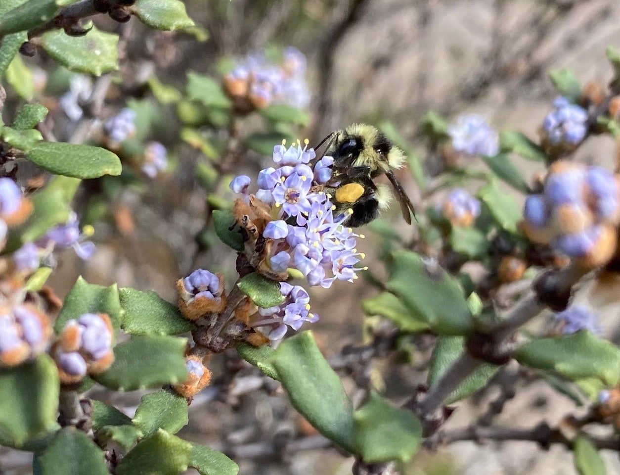 It is almost noon when the sky begins to clear as I head back to the front gate. I am delighted to find the Otay Mountain Ceanothus, Ceanothus otayensis near the front gate already in bloom. A few small worker Black-tailed Bumble Bees, Bombus melanopygus (family Apidae) are busily foraging on the clusters of tiny pale blue flowers. These workers are comically small, barely 1/5 the size of a queen bee. Members of the first brood produced by the bumble bee colony tend to be exceptionally small. Having been raised single-handedly by the queen, a single mom, these workers were probably somewhat under-nourished as larvae. However, what they lack in stature they more than make up for in diligence. Check out the hefty pollen load on this worker’s hind leg!
