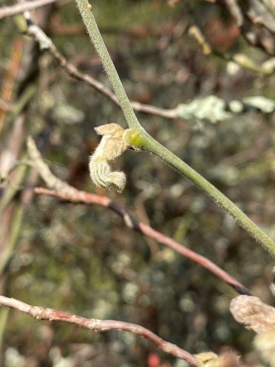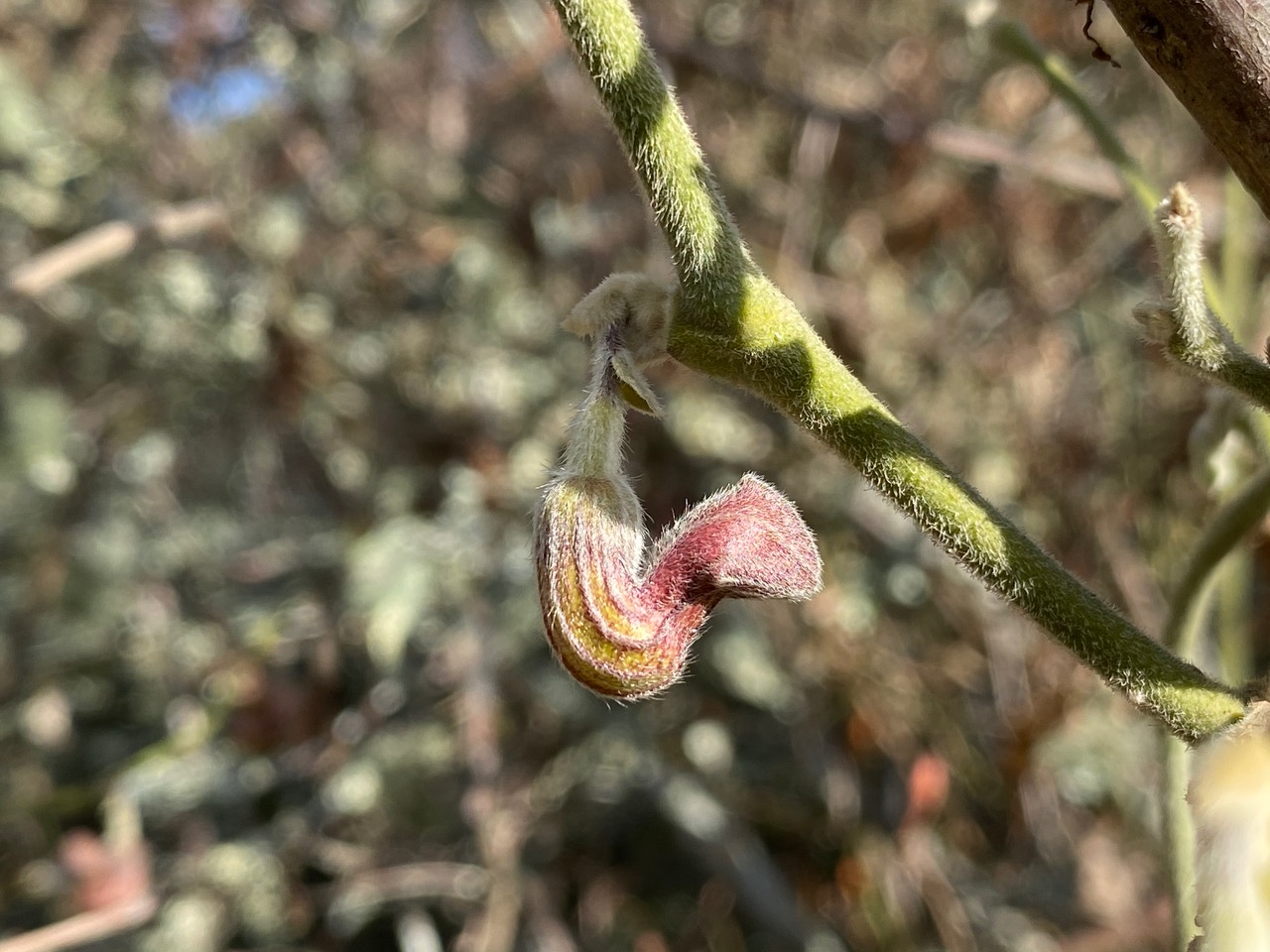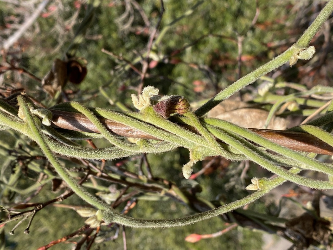 Flower buds are swelling and maturing on the California Pipevine, Aristolochia californica, here twining on a tall dormant Western Azalea.