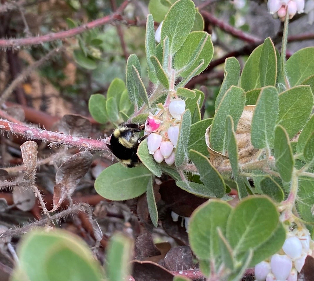 The bee lands upside-down from a manzanita flower and sticks her tongue in to sip nectar. Bumble Bees have long tongues that can access the hidden nectar easily.