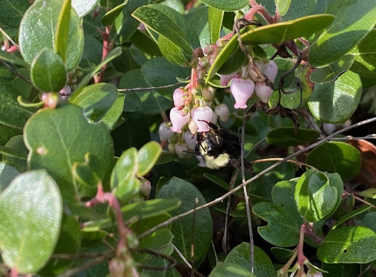 A queen Black-tailed Bumble Bee, Bombus melanopygus (family Apidae) is lifting off from a cluster of manzanita flowers. My heart swells with pride and admiration for these hardy bees out foraging in such cold weather.