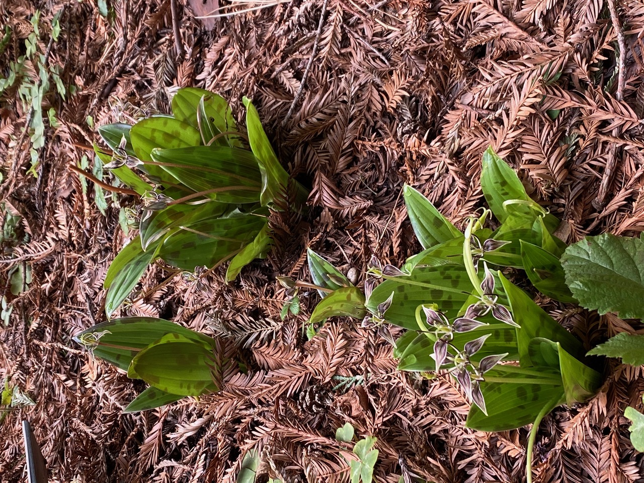 I briefly check on the Fetid Adder’s Tongue, Scoliopus bigelovii under the redwood trees for pollinators, the fungus gnats. No, there are no insects visiting the little flowers.