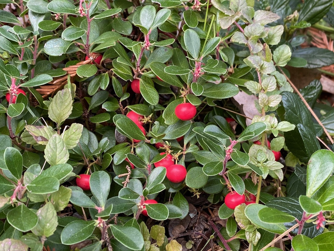 It is a delight to come across cheery red berries in the middle of winter. What is going on here? Are these fruits from last year? The fruits, together with very young flower buds are hanging on this prostrate manzanita, Bearberry (or Kinnikinnick), Arctostaphylos ova-ursi growing at the edge of the redwood forest.