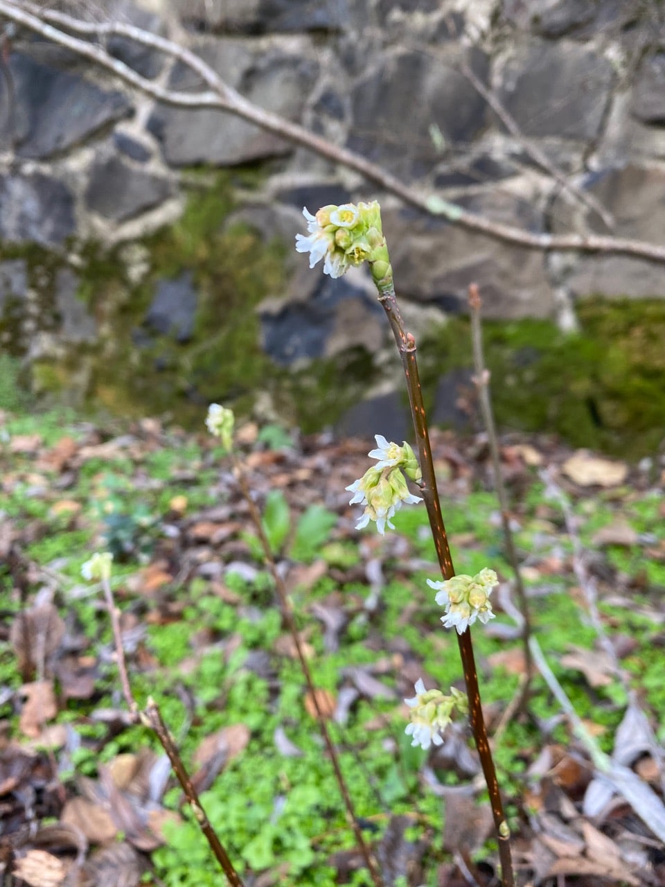 An unfamiliar species of Osoberry, Oemleria sp. has started to bloom in clusters at regular intervals along straight leafless stems.
