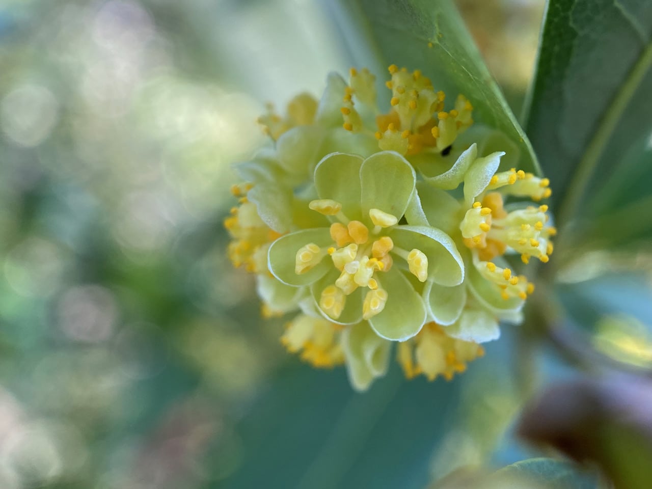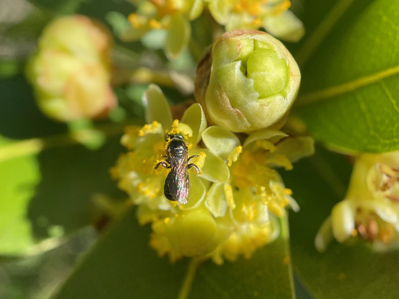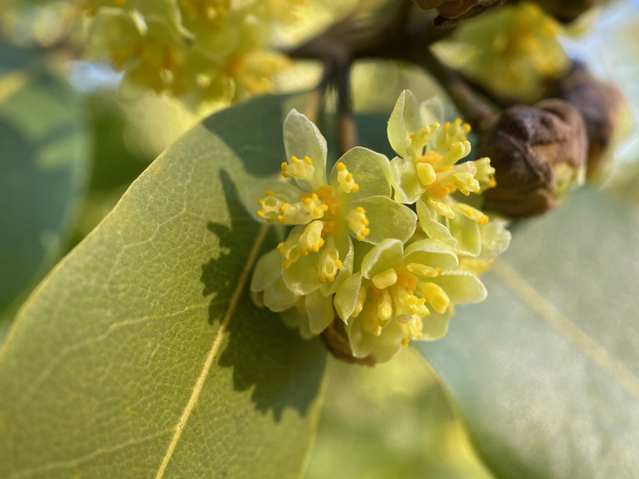 These bay flowers are fully open, loaded with pollen. Someone must’ve been rummaging in the flowers, spilling pollen onto the leaves.