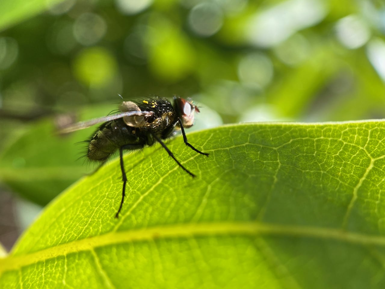 An unidentified fly lands on a bay leaf, some yellow pollen stuck to its thoracic hairs. It must have been visiting the bay flowers. A potential pollinator?