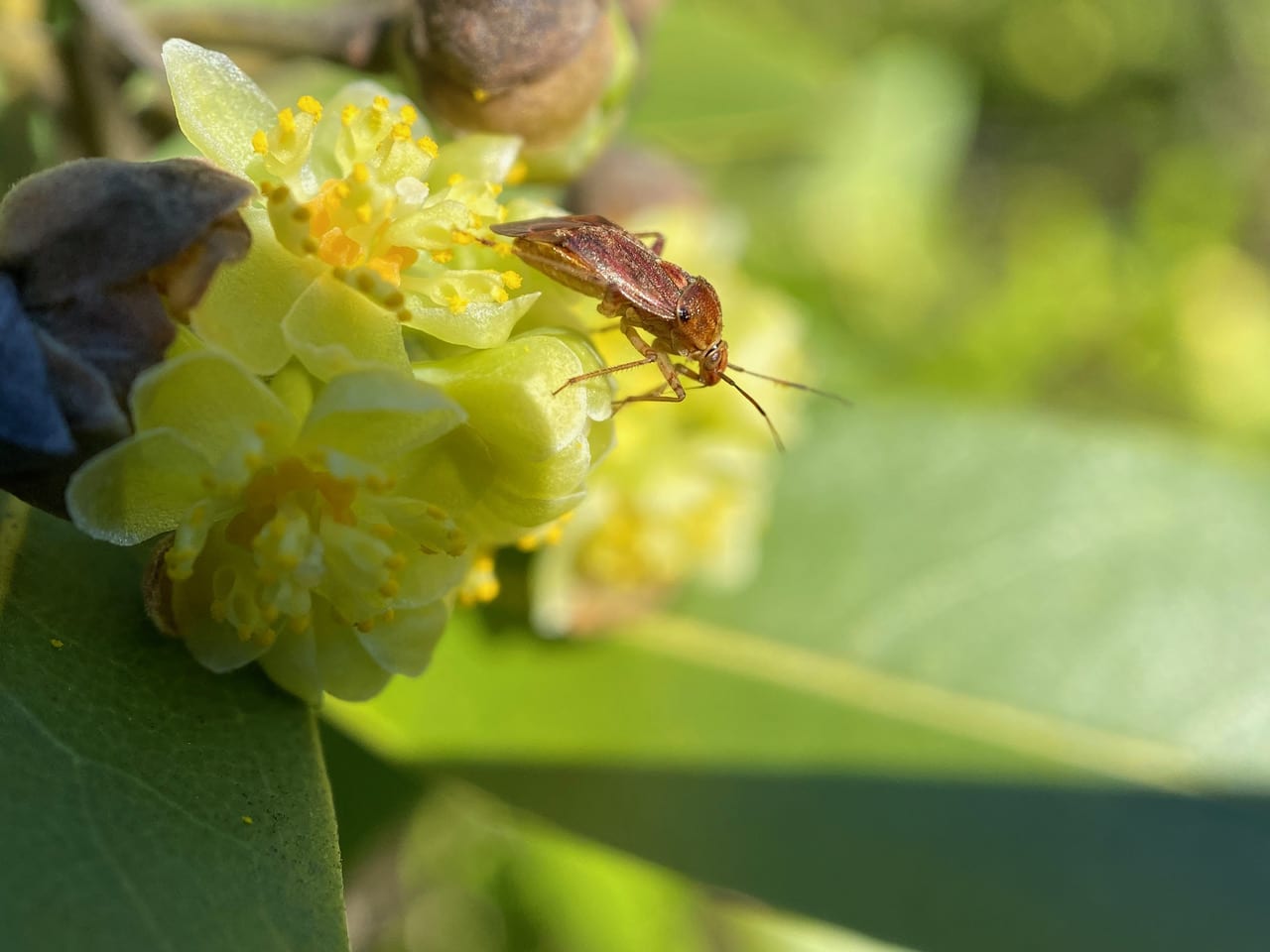 As the morning warms up, I have to take off my jacket – it’s approaching 70 degrees F, rather unusual for winter. Insects begin to appear on the Bay Trees. Its proboscis lowered, a chestnut-colored Plant Bug (family Miridae) is hunkered over a Bay flower, feeding.