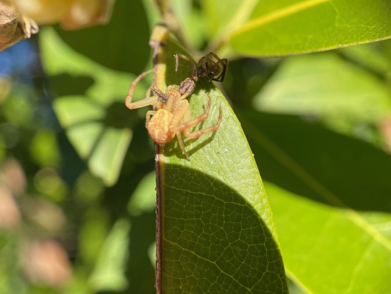 There appears to be spider action in the shadows under a cluster of Bay flowers. I tilt the leaf into the sun to get a better look. Wow, a female Crab Spider, Mecaphesa sp. (family Thomisidae) has captured another spider and is probably feeding on it from the abdomen. The crumpled prey is motionless, legs folded in contortion. What’s that thing on the Crab Spider’s cephalothorax? Has she been stabbed during the struggle, and a part of the prey’s body is still embedded in her?