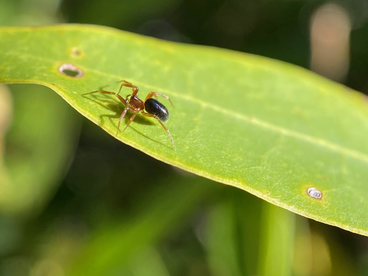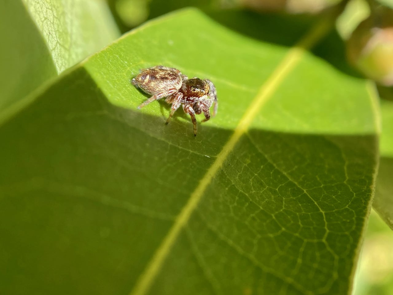 Look, here’s a Jumping Spider on a Bay leaf. I think it is a Coppered White-cheeked Jumping Spider, Pelegrina aeneola (family Salticidae).