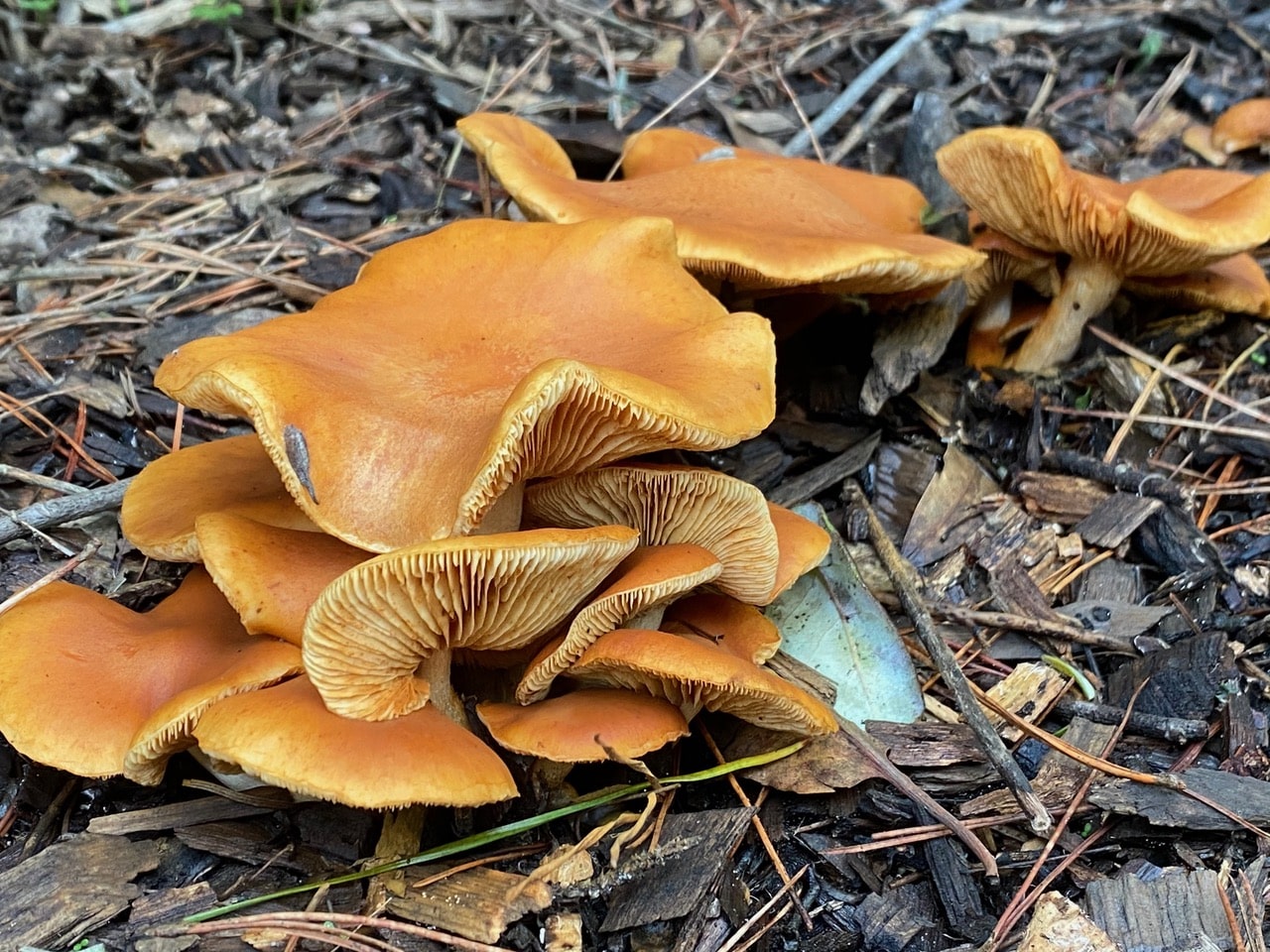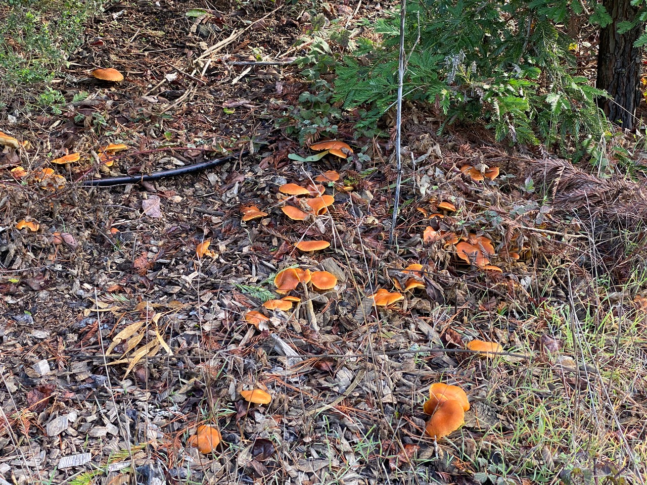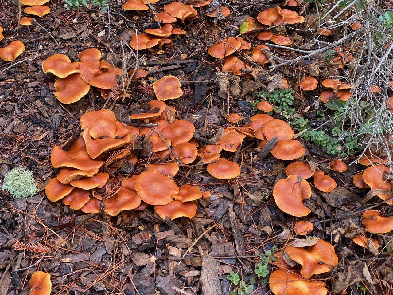 Golden-orange mushrooms grow profusely on the wood chips in an area where Coast Redwood trees are being restored in the park.