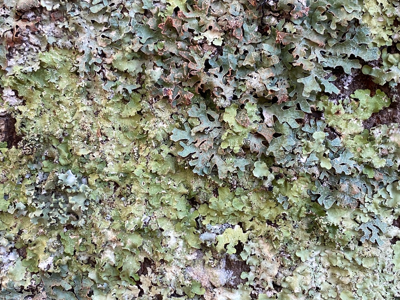 Speckled Greenshield Lichens, Flavopunctilia sp. cover the surface of a lower section of a tree trunk.