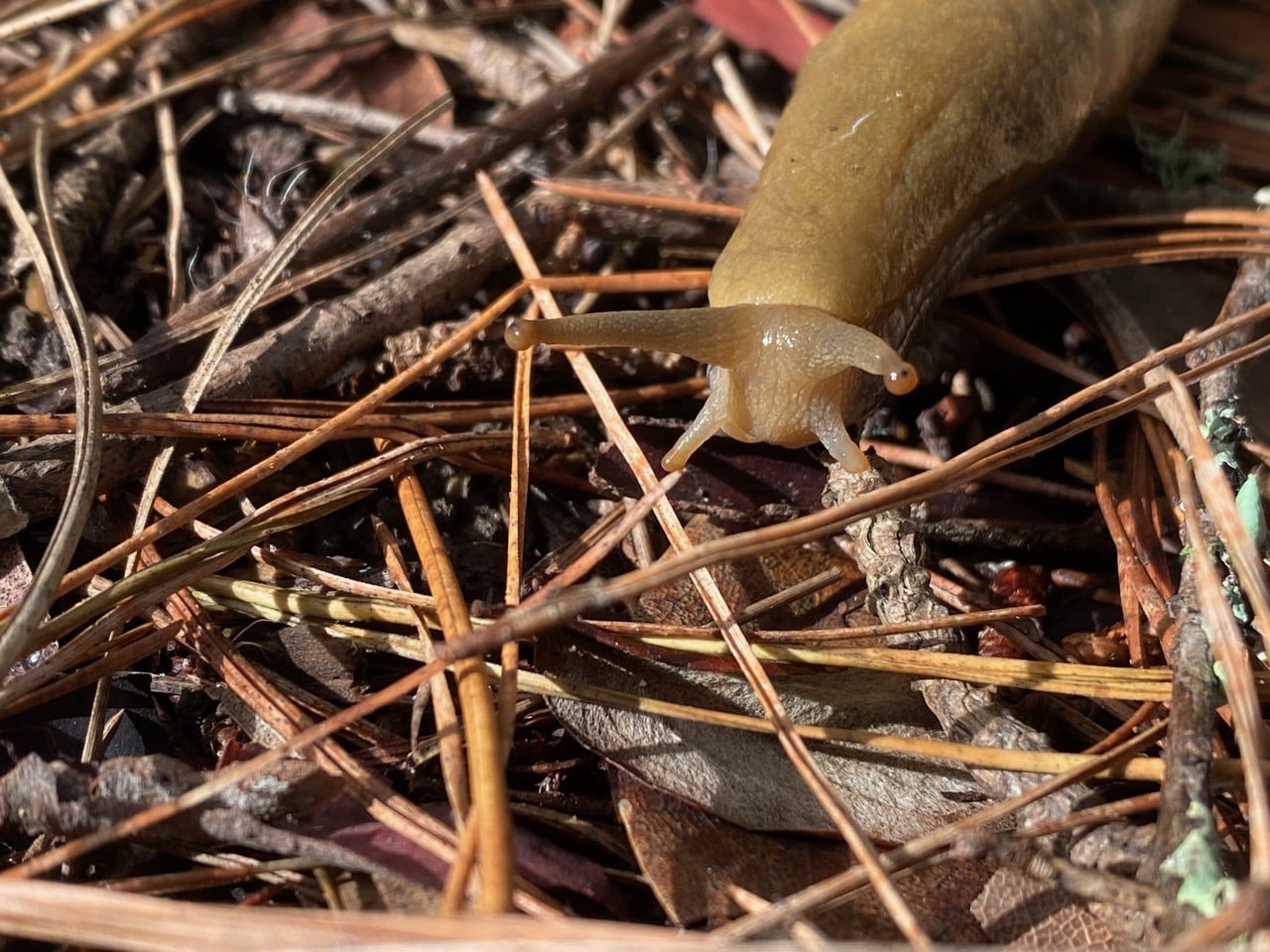 Focusing on mosses and lichens, I nearly step on a well-camouflaged Banana Slug. Stretched out long and thin, it is gliding imperceptibly on the pine duff.