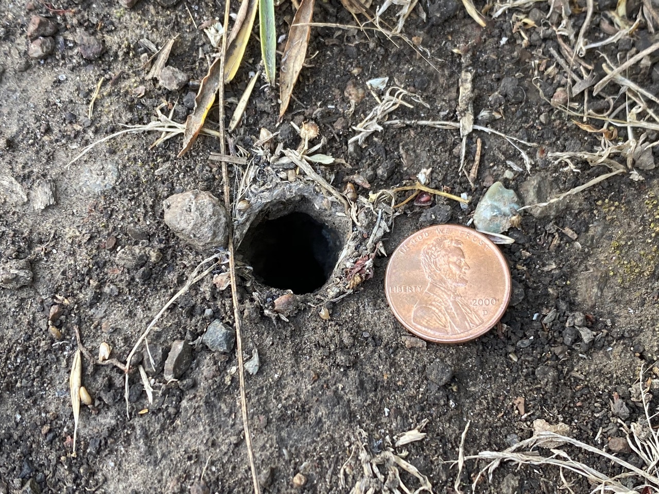 The silk-lined spider burrow near the tree stump by the trail is open today! This burrow has been around for a while, sometimes disappearing without a trace. I marvel that the spider (probably a False Tarantula, Calisoga sp.) is able to conceal the entrance so well. As spider mating season is upon us, I look forward to seeing more spider activity.