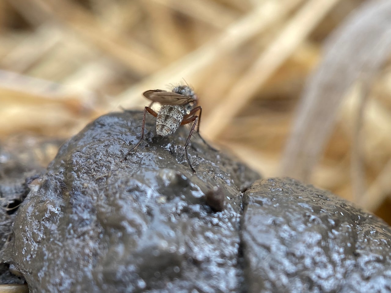 Our dung visitor has been identified as a, what else, Dung Fly (family Scathophagidae)!