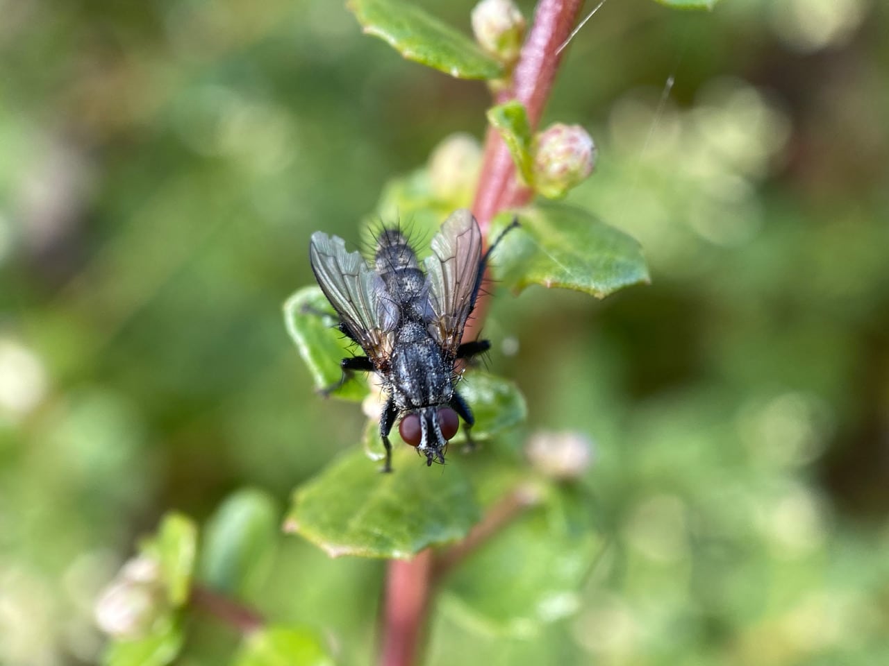 One of the most common flies in the garden, the Woodlouse Fly, Stevenia deceptoria (family Rhinophoridae) visits everything that is in bloom. I encounter these parasitoid flies more often than I see their host, the pill bugs.