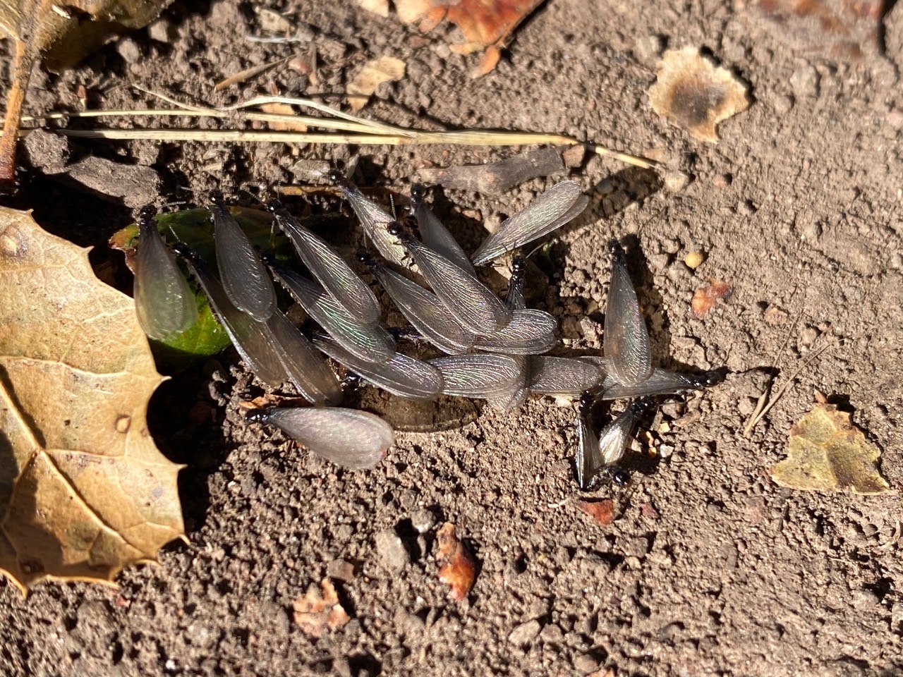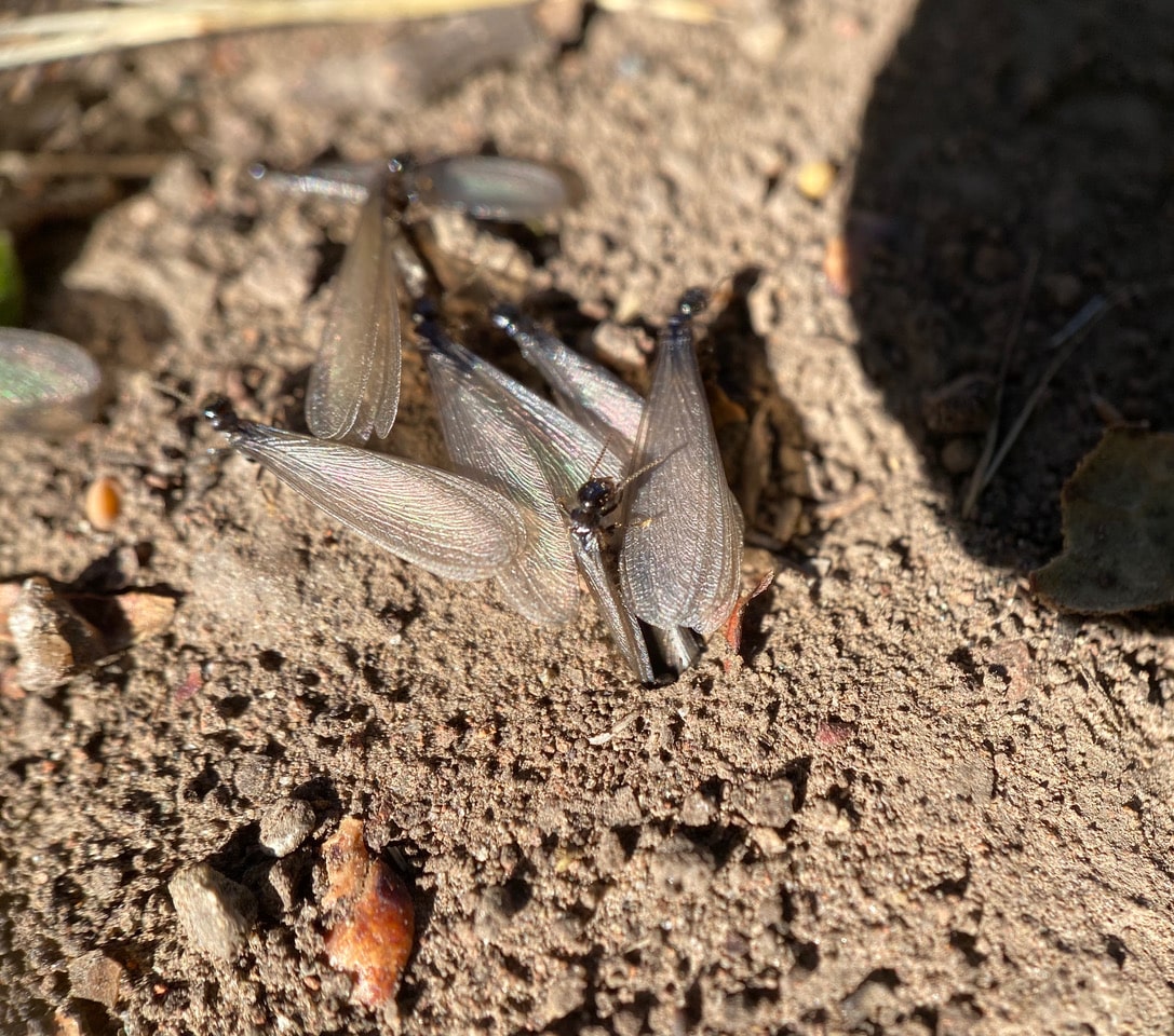 There are glittery movements on the trail ahead of me. They are the wings of the Western Subterranean Termites, emerging from a couple of small holes in the ground. It is a warm, relatively windless autumn day after a rain – conditions considered to be perfect for termite nuptial flight! This is a relatively small eruption, with only about a hundred termites milling around after they emerge from the holes. Note the ones just emerging from the ground on the lower right of the group.