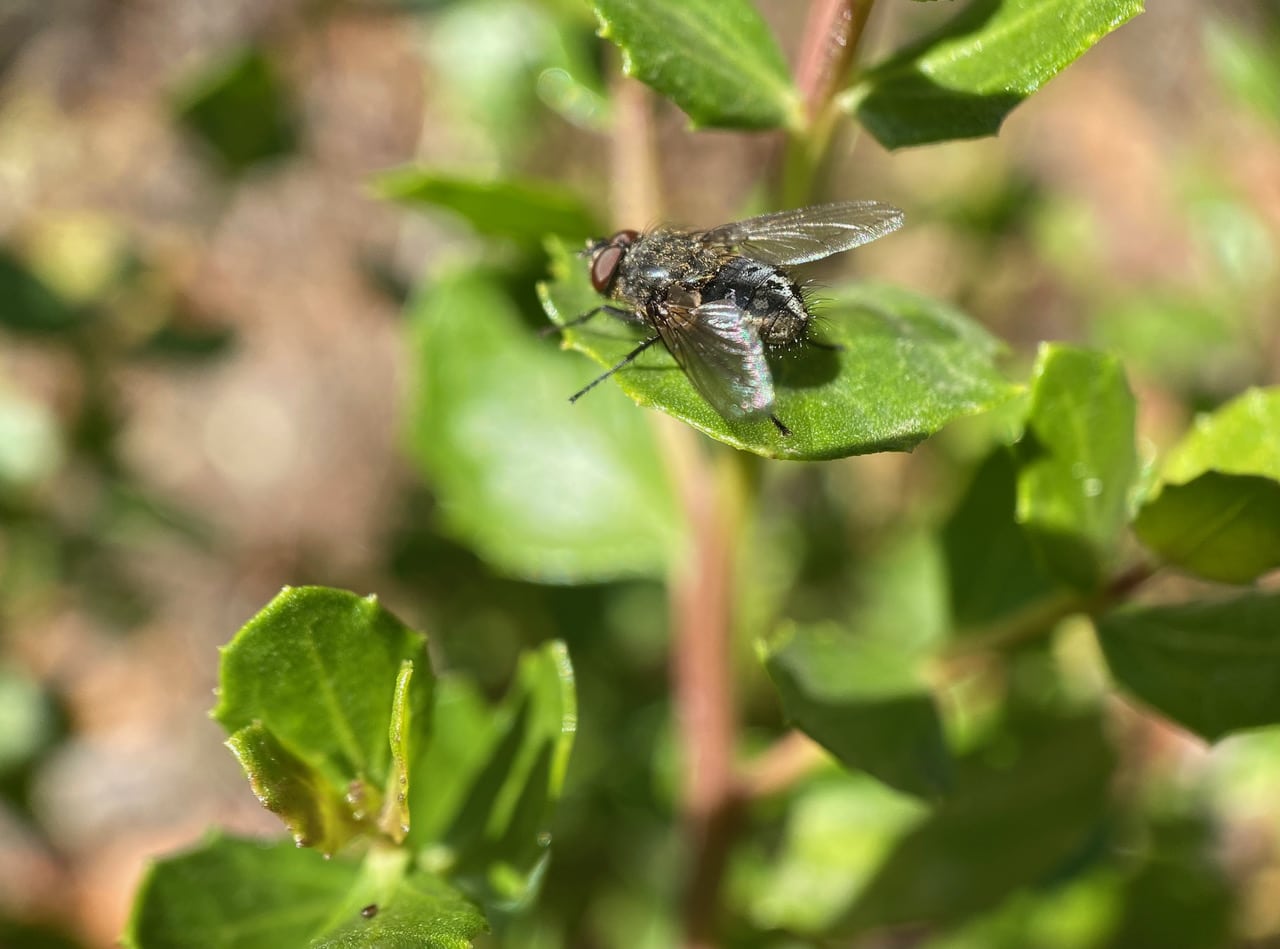 A Common Cluster Fly, Pollenia rudis (family Polleniidae) lands on a Coyote Brush. Here we can see the characteristic checkered black and silvery-black abdomen.