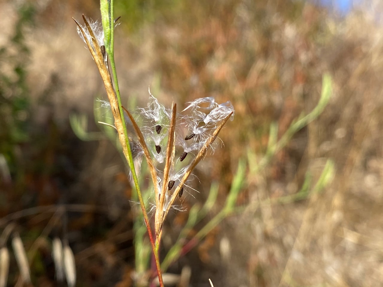 The seed plumes of Willowherbs, Epilobium sp. (family Onagraceae) growing in the underbrush along Skyline Trail shine silvery in the sunlight. I must have failed to notice the plants while they were in bloom! I love how the long seed pods crack open longitudinally to release the neatly stacked seeds to the wind. There are two native species of Willowherb in California. I recall with fondness how these drought resistant plants supported pollinators through the dry summer and fall at the Bridgeview Pollinator Garden. The annuals reseed themselves profusely. Although the Willowherbs may look a little weedy and their flowers are inconspicuous, I consider them good candidates for the native garden for their ecological contributions.