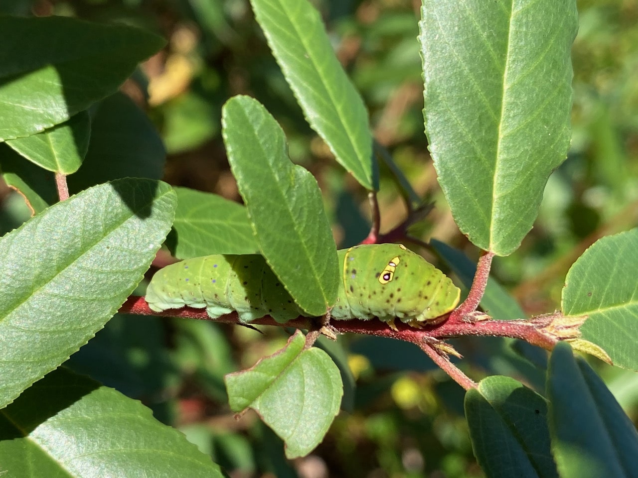 After some serious searching, I finally find B2 on a different branch that is quite a distance from where it was yesterday. I am not sure if it is even the same coffeeberry. There are multiple stems that grew out of the ground, and B2 is on a completely new branch. It must be exhausting for a little caterpillar to travel that distance! Wow, what are all those spots on B2?