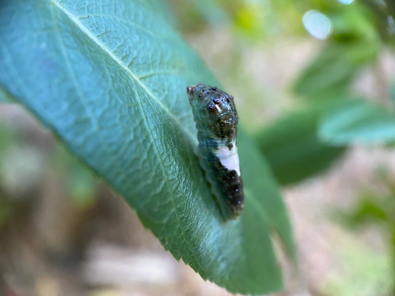 Our Pale Swallowtail caterpillar B2 has disappeared from its previous perch on its Coffeeberry host plant. It looks like it has eaten part of the leaf at the tip. It’s good to know that B2 is still eating despite being sick.