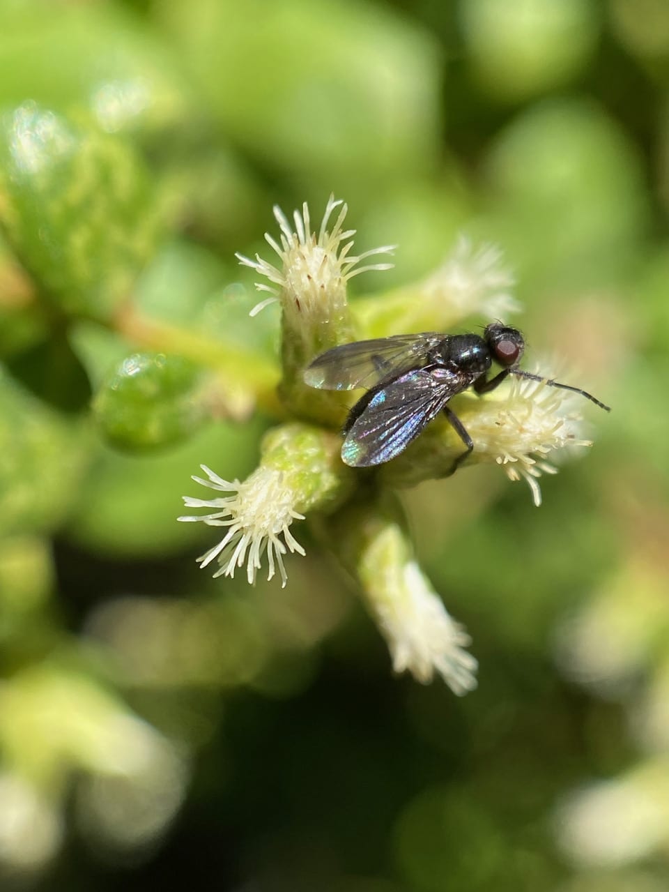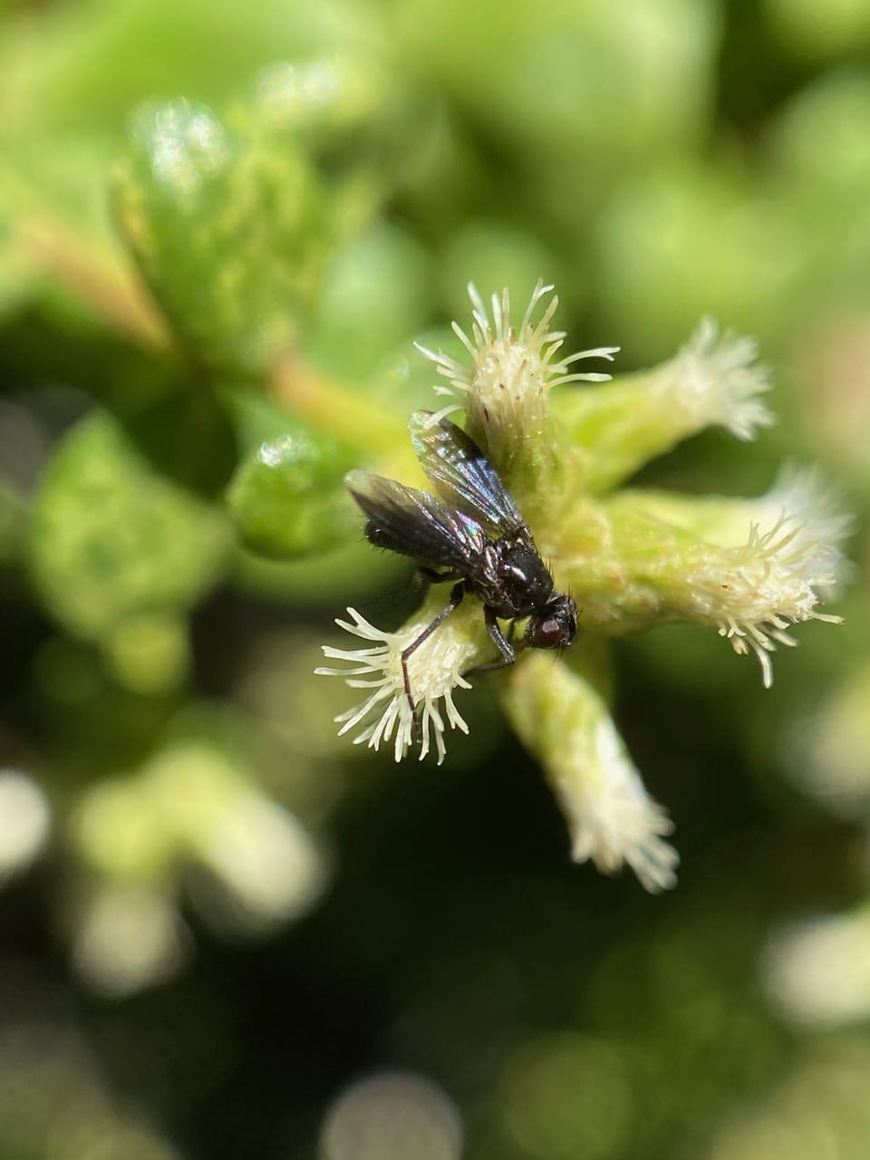 A small, glossy black fly is foraging among the female Baccharis flowerheads.